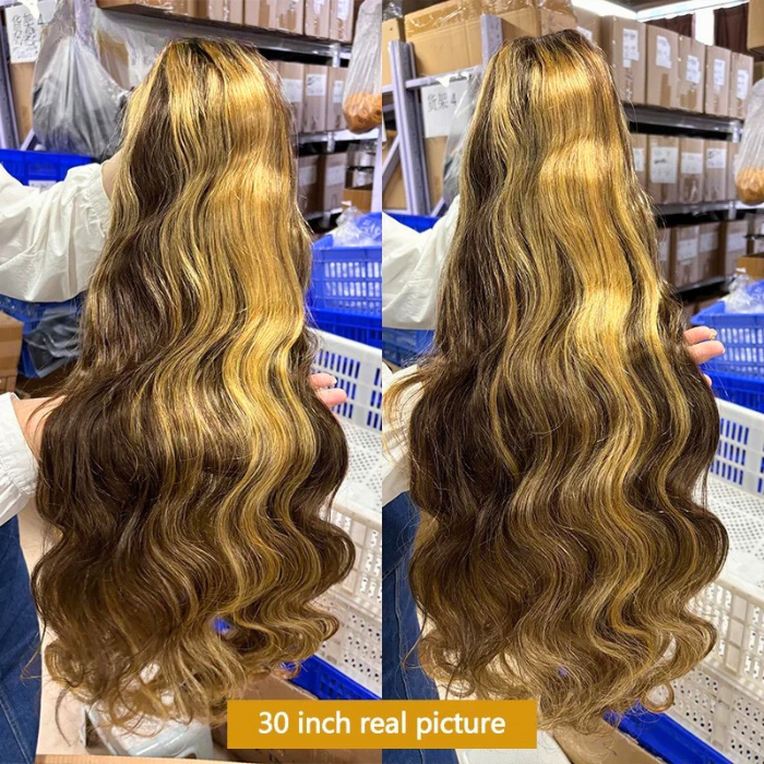 Turn heads with this Blonde Highlight Lace Frontal Wig, crafted from 100% human hair for a soft, natural feel. Featuring a 13x4 HD transparent lace frontal, this wig blends seamlessly for a flawless hairline. The curly body wave texture adds volume and bounce, while the pre-plucked design with baby hair ensures a realistic and effortless look.