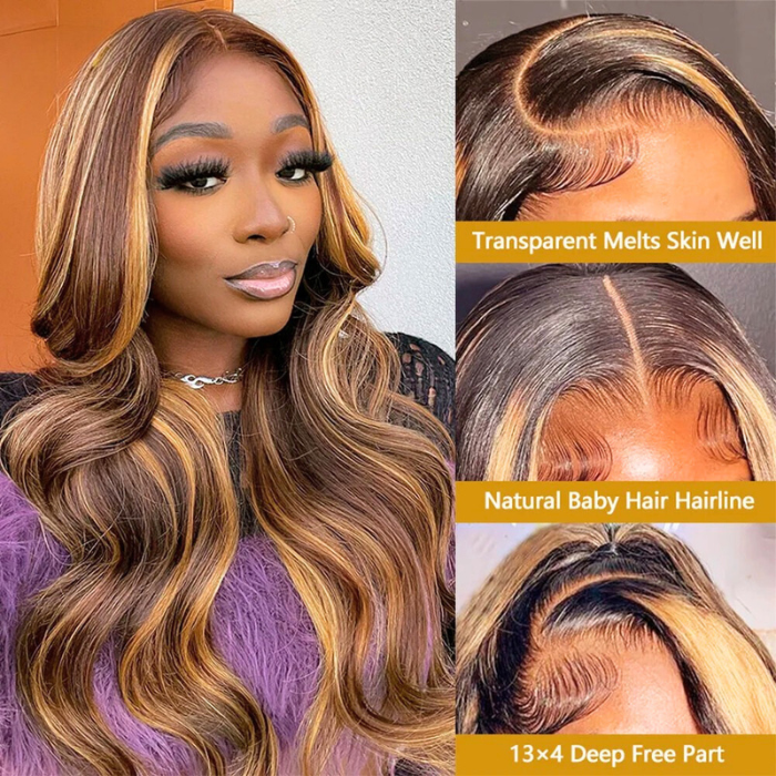 Blonde Highlight Lace Frontal Wig – 13x4 HD Transparent Curly Body Wave Human Hair Wig, Pre-Plucked with Baby Hair