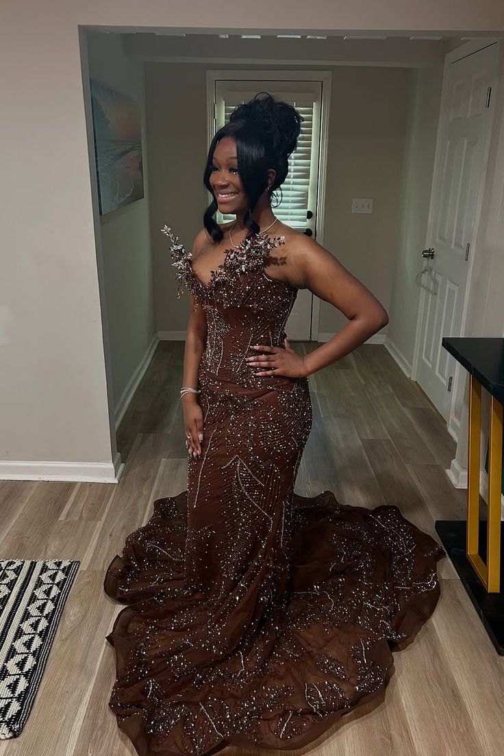 Make a grand entrance in the Brown Sparkling Crystal Beading Mermaid Prom Dress. This stunning gown features shimmering crystal beadwork, a fitted mermaid silhouette, and a rich brown tone that radiates sophistication. Designed for prom nights and glamorous occasions where you want all eyes on you.