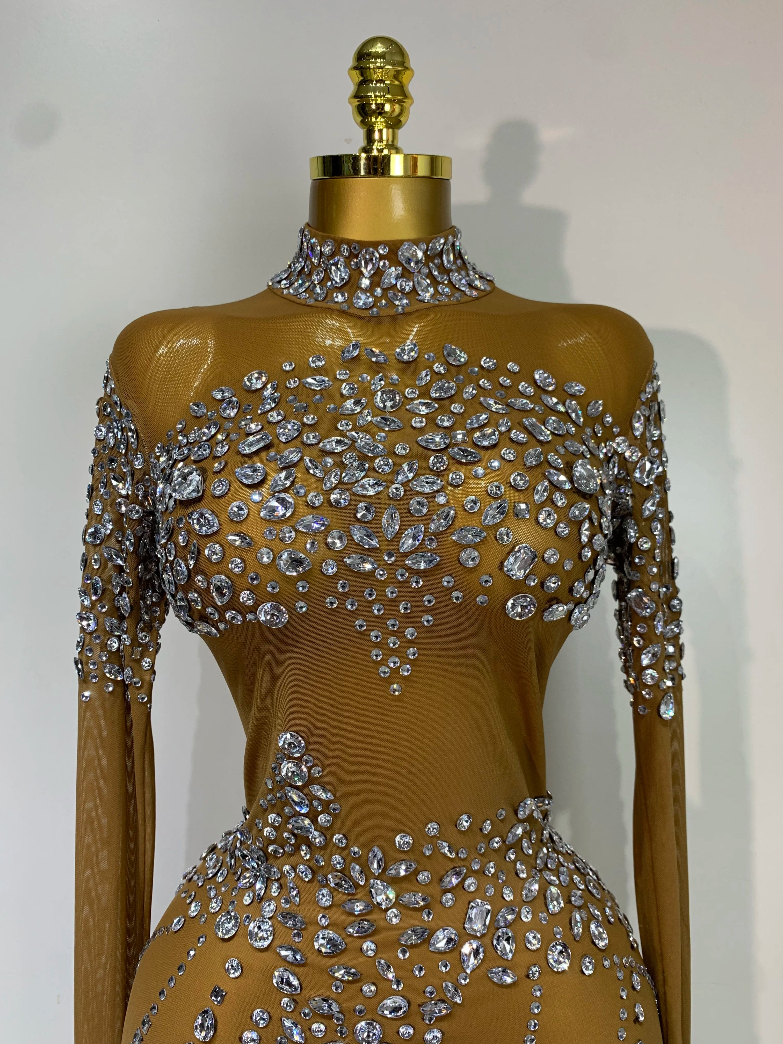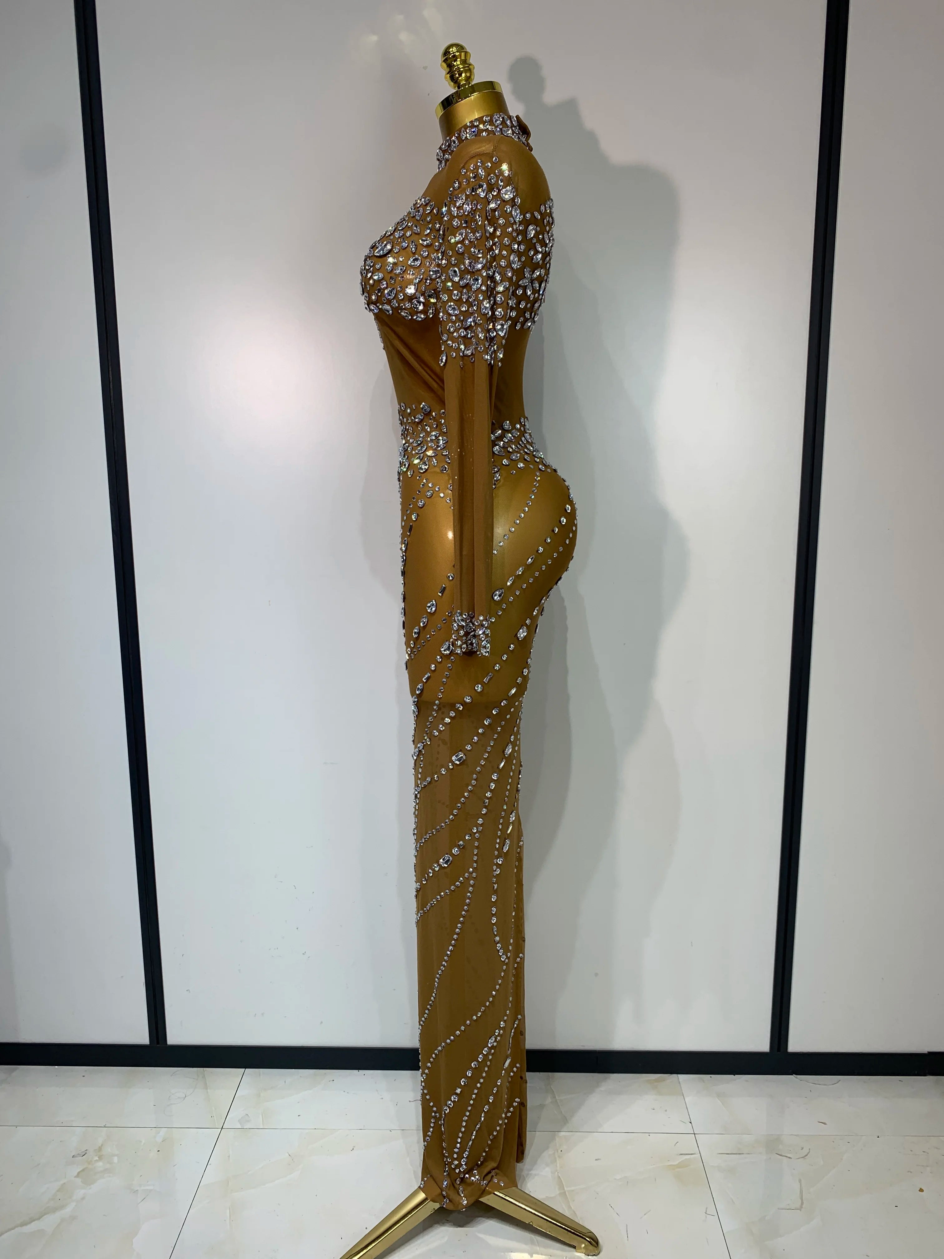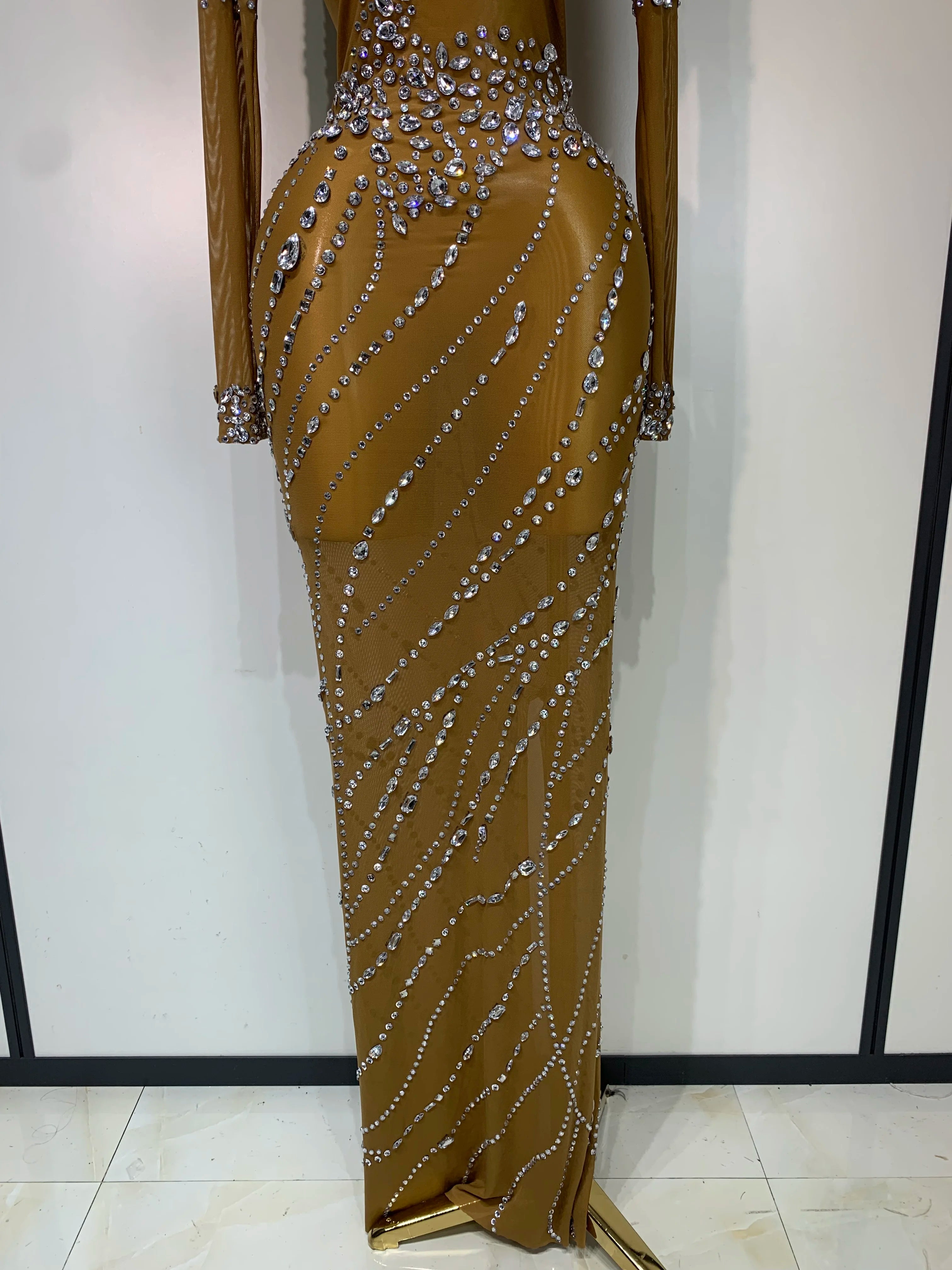 Colette sparkly brown rhinestone mesh transparent long dress for evening parties and nightclub dancers.