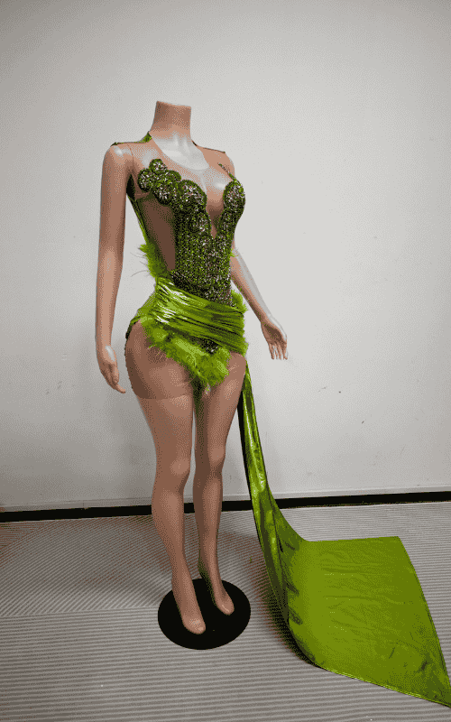Command attention in this crystal embellished illusion suit designed with feather accents and a dramatic floor length sash. Created for red carpet moments, stage performances, luxury parties, and high fashion evening events, this statement suit blends sheer illusion structure with precision crystal detailing for maximum visual impact.