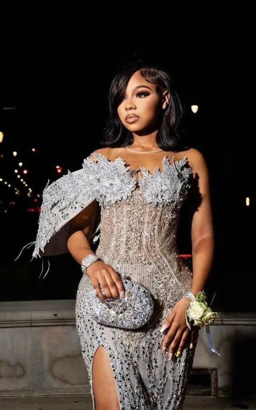 Sequin one-shoulder crystal mermaid prom dress with sparkling detailing and dramatic silhouette.