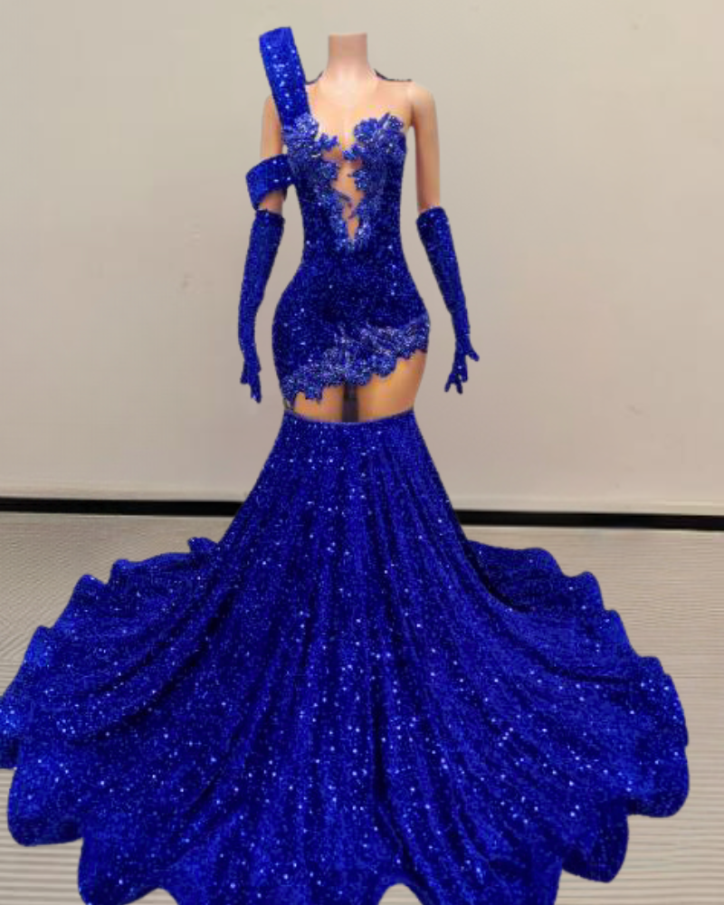 shiny sequin mermaid prom dress with a fitted silhouette and flared hem