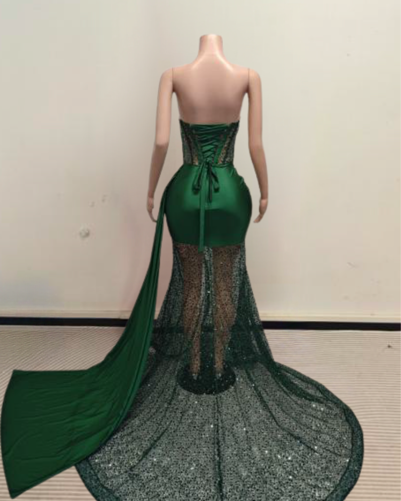 Simone sparkling emerald prom dress with green sequin details and elegant fitted design.