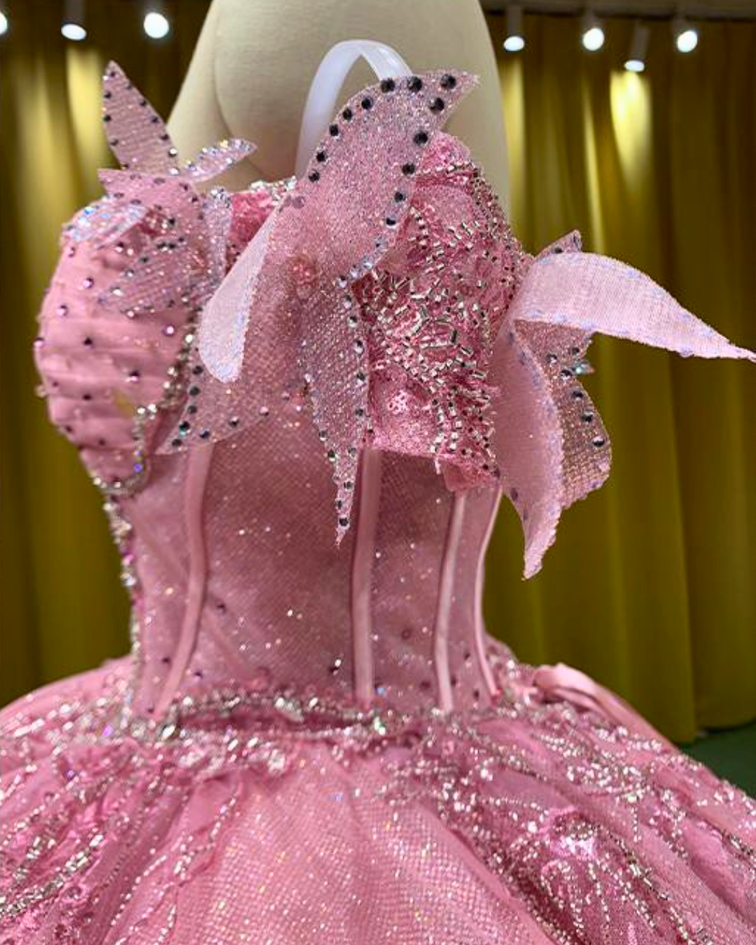 Baby pink quinceañera gown with glitter details, lace trim, and full princess ball skirt.