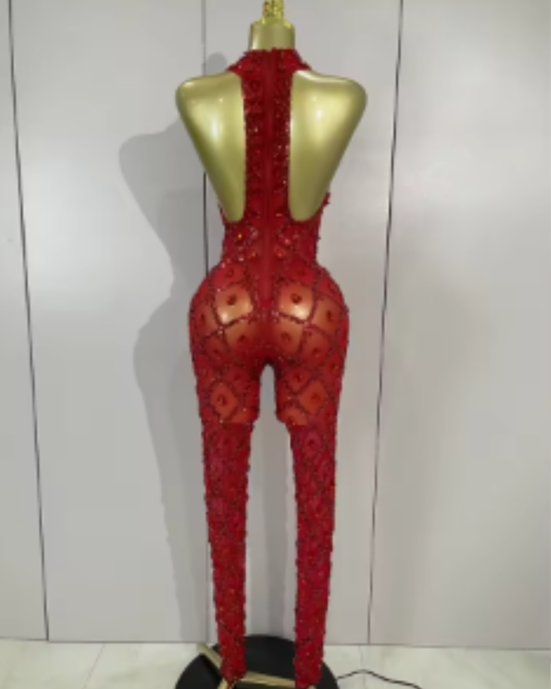 Teyah Sparkly Red Diamonds Mesh See Through Jumpsuit