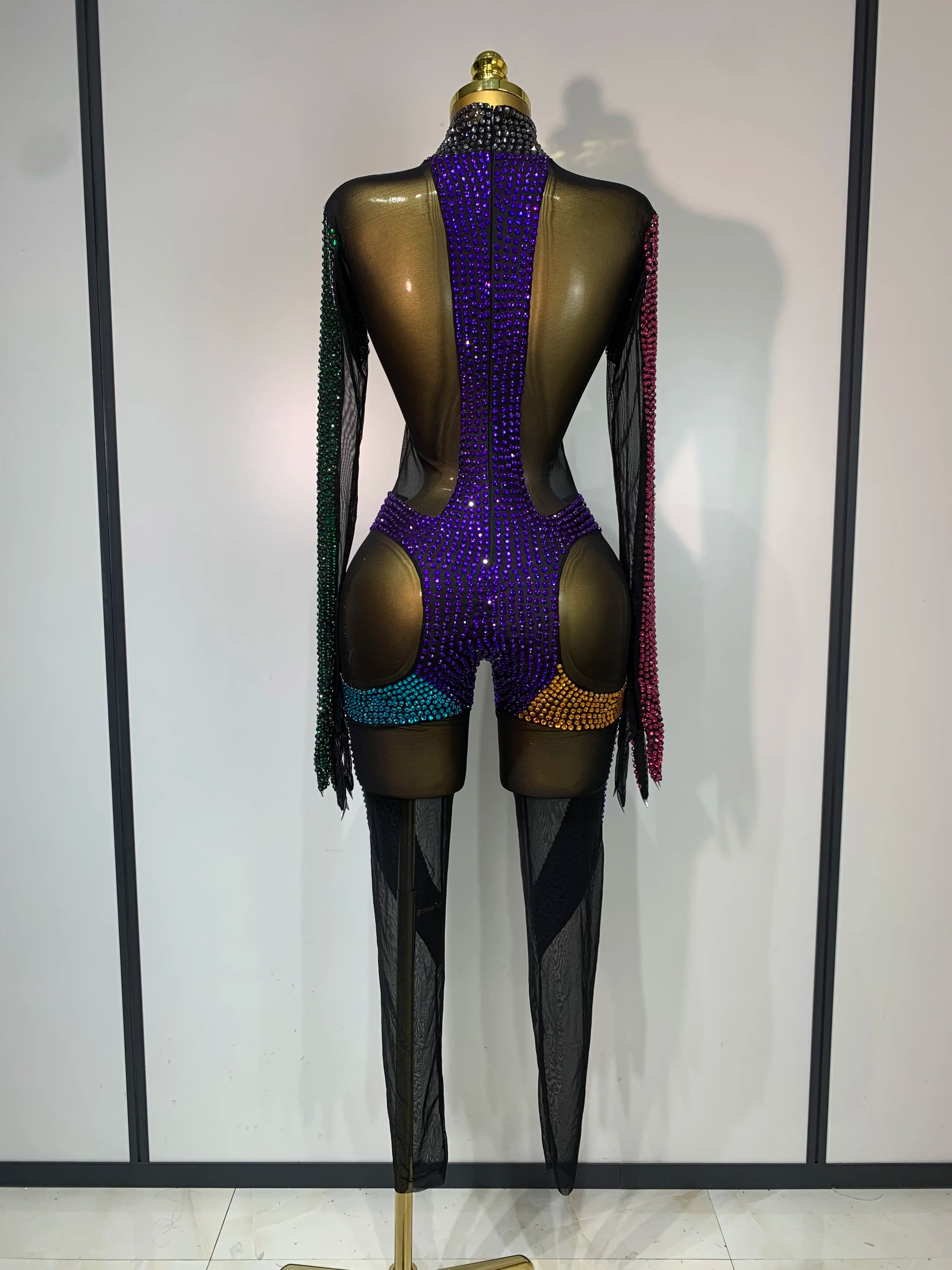 Perfect for Spring 2025 and suitable for all seasons, this sleek, body-hugging jumpsuit features diamond embellishments that add a touch of glamour to your outfit. The ankle-length pencil-style pants elongate your silhouette, creating a bold and elegant look ideal for parties, club nights, or special events.