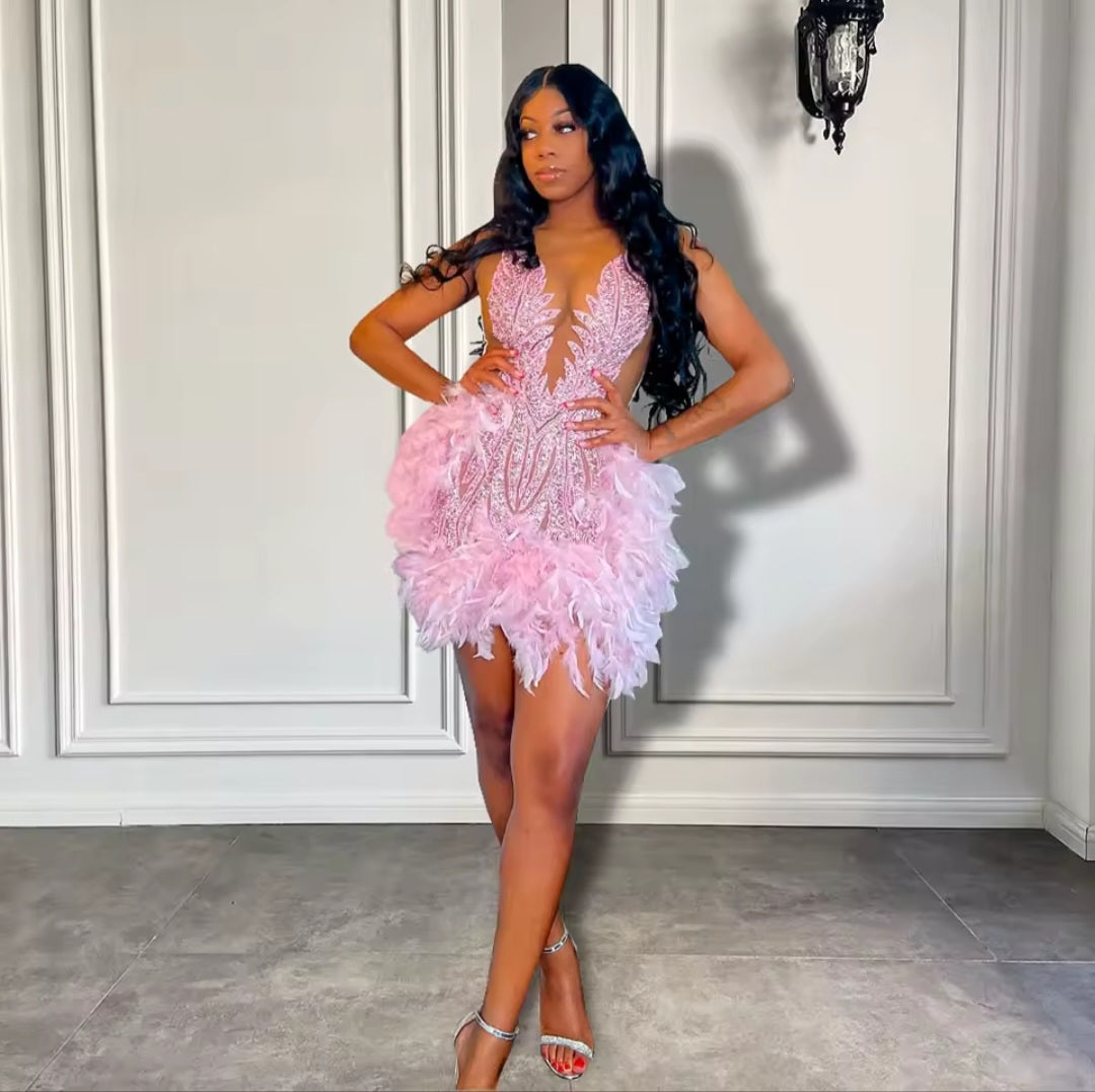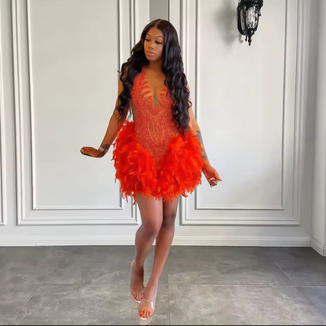 Intricate beading, crystals, sequins, and feather embellishments deliver a glamorous, illusion-inspired effect that shimmers with every movement. The sleeveless design with regular armholes keeps the focus on the embellishments while allowing comfort and ease of wear.