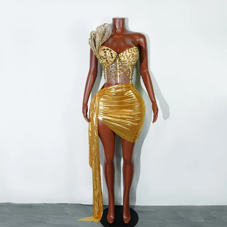 Shine in this golden backless corset dress, crafted from a smooth linen, nylon, and spandex blend for a perfect fit. Featuring a corset-style top, asymmetrical hem, and a long ribbon detail on one side, this stunning piece combines elegance and modern flair—ideal for evening events or special occasions.