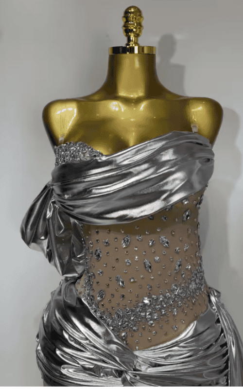 Perfect for evening parties, birthdays, nightclub events, photoshoots, and formal celebrations, this dress blends glamour, structure, and shine into one unforgettable look.