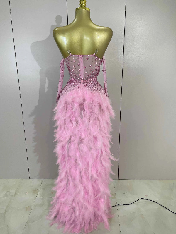 Luxury Sparkly Rhinestones Chain Feathers Bodysuits Long Tail Dress Sexy Mesh Sheer Stage Evening Party Celebrate Birthday Dress