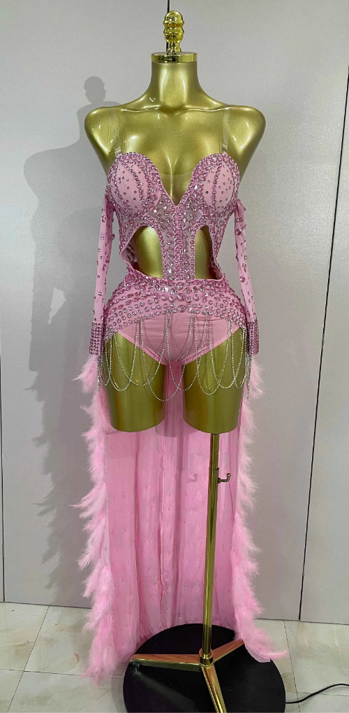 The Mira dress is built for pure spotlight domination. Designed with a sheer mesh base and sculpted bodysuit fit, this piece is covered in sparkling rhinestones and chain details that contour the body with high-fashion edge. Feather accents add soft movement and texture, while the dramatic long tail creates a powerful, stage-ready silhouette. Bold, glamorous, and unapologetically statement-making, this dress is perfect for performances, birthdays, evening parties, photoshoots, and unforgettable entrances.