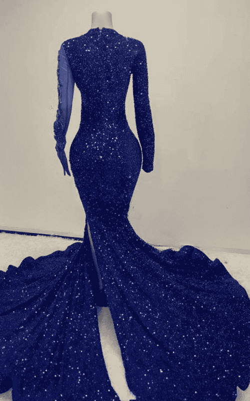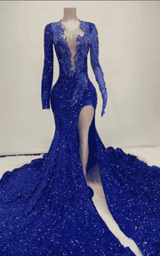 Perfect for shoppers searching for royal blue prom dresses, sequin mermaid gowns, long sleeve formal dresses, and luxury evening statement pieces. Pair with silver or neutral heels to keep the focus on the color and shine.