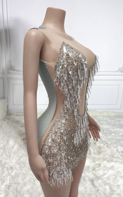 Turn every head in the room with this Sheer Mesh Crystal Party Dress, designed with sparkling water drop rhinestones that shimmer under the lights. The sexy sheer mesh design flatters your curves while adding a bold, glamorous touch—perfect for nightclubs, parties, or special events. Crafted for confident women who love to stand out, this dress combines elegance with seductive sparkle.