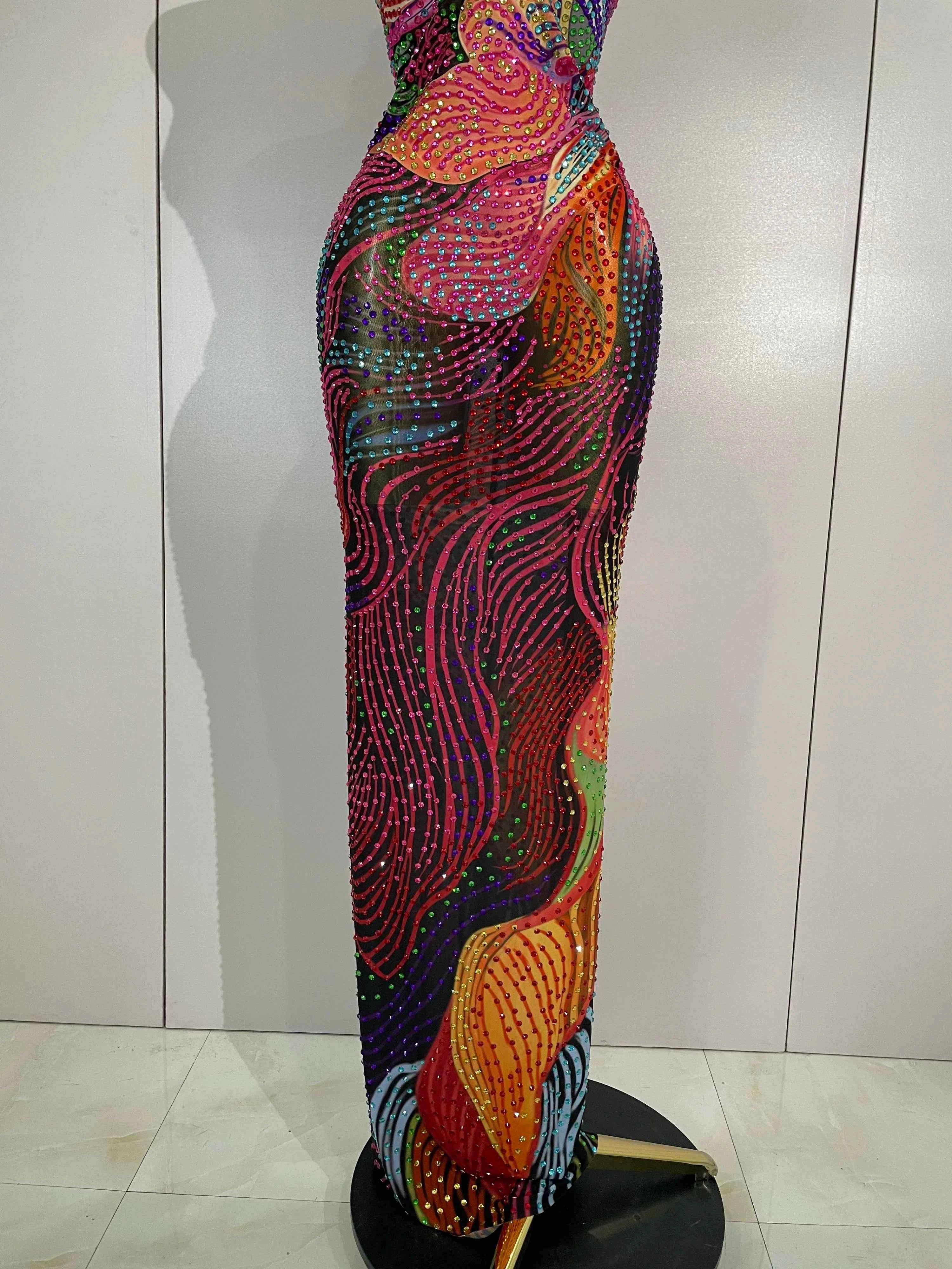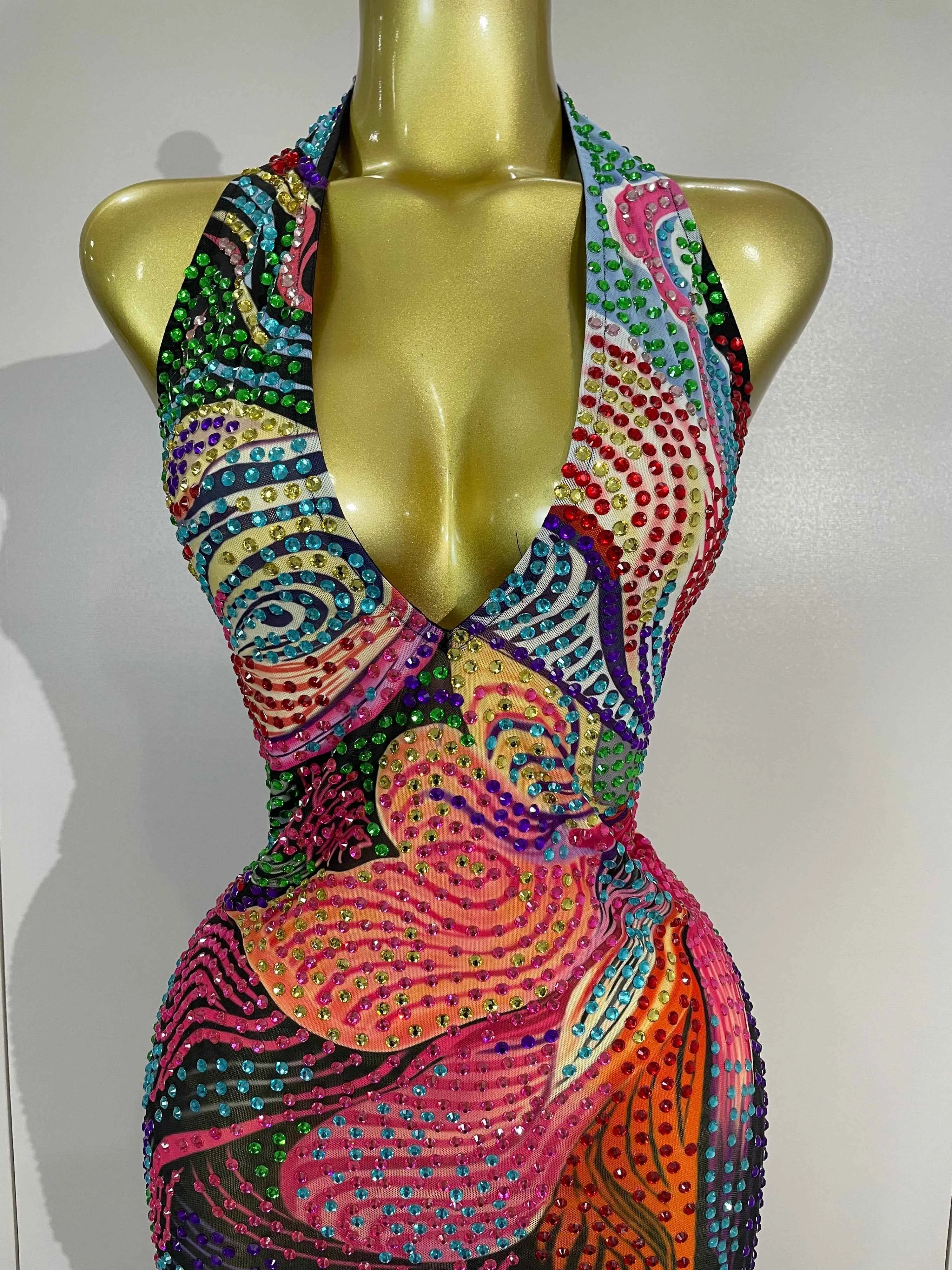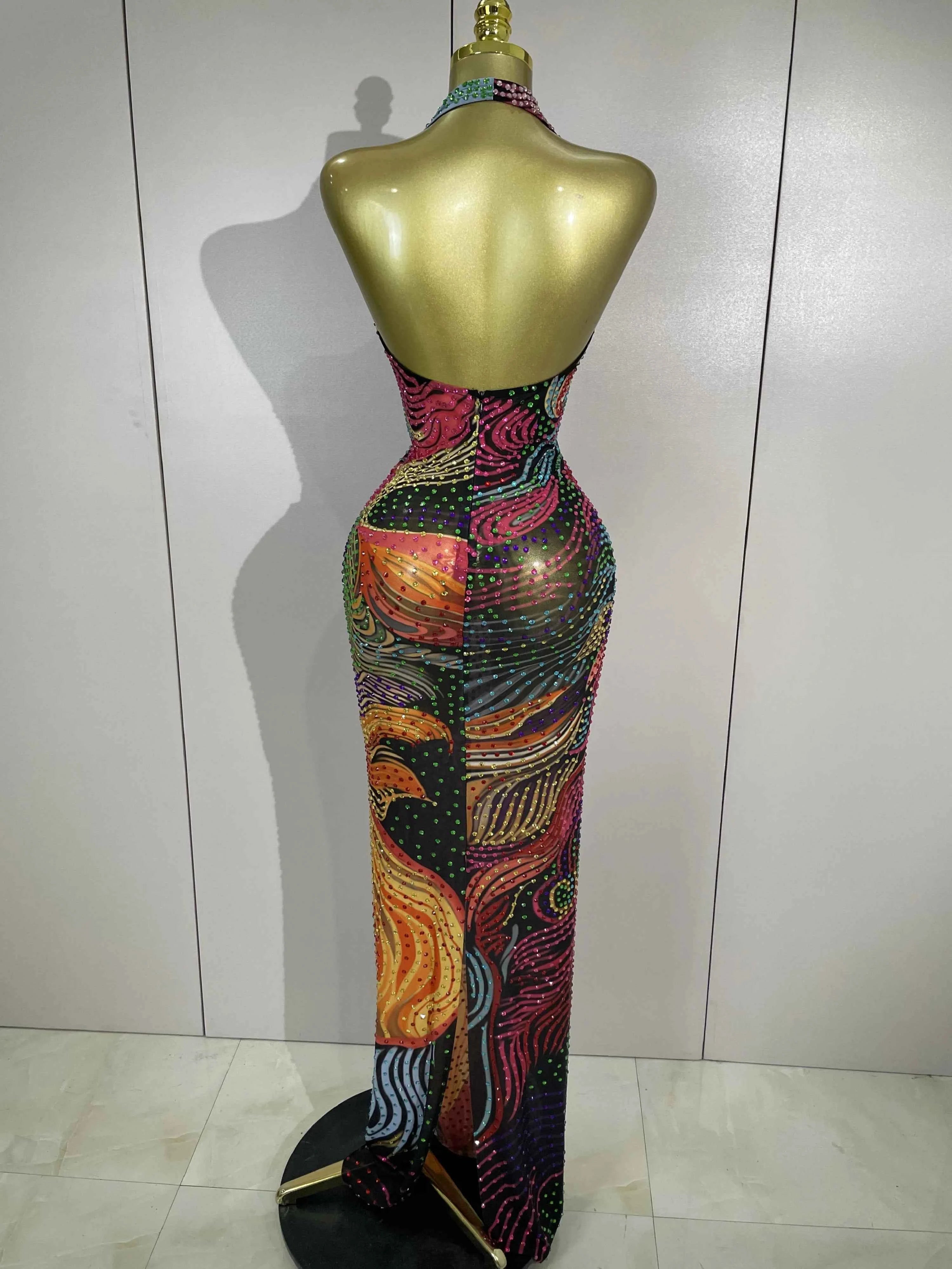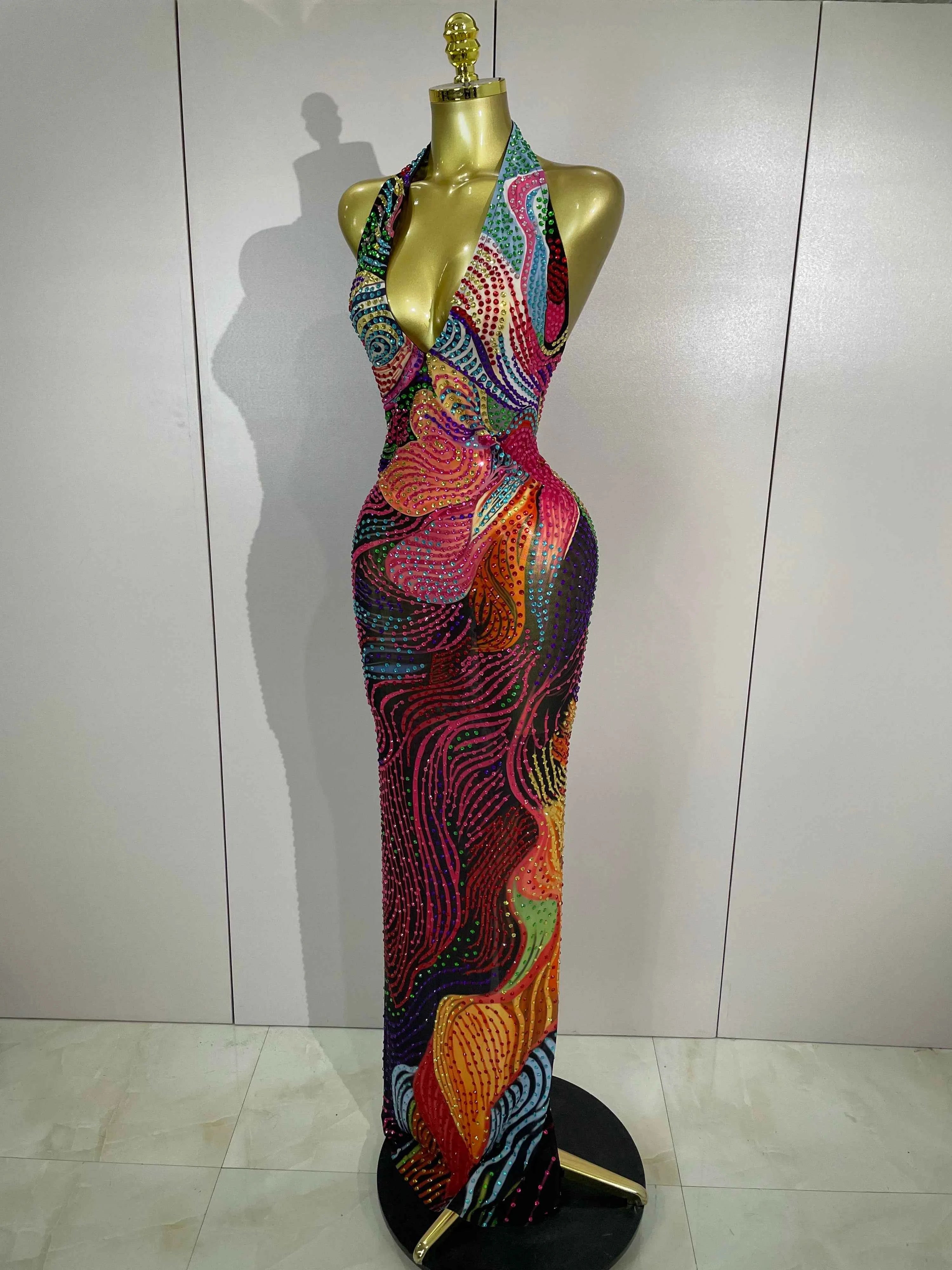 Sexy Colorful Rhinestone Print Long Dress Woman Halter Deep V Neck Backless 2026 Women Birthday Eveing Party Club Stage Costume