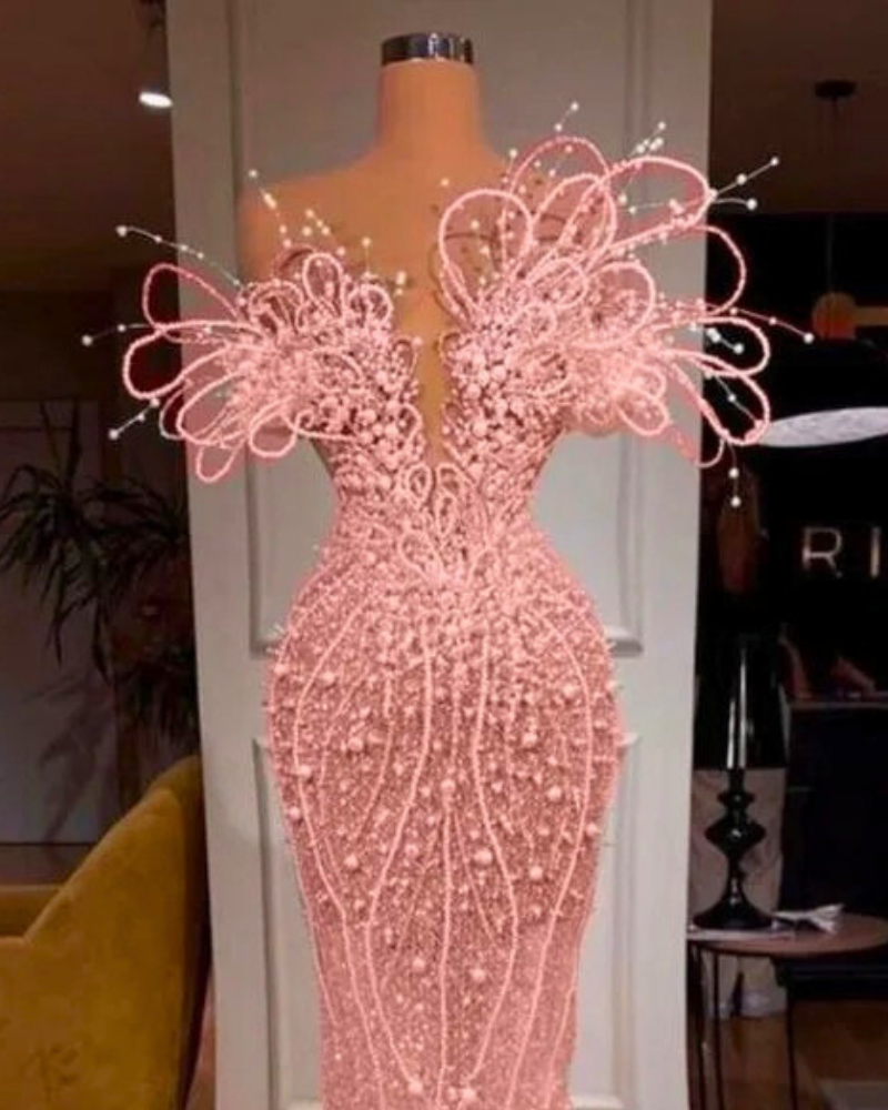 Shiny pearls beaded sequin prom dress elegant sparkly gown for women.