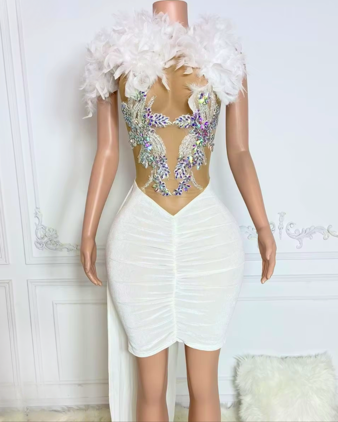 Sleeveless white birthday dress with feather accents and rhinestones, styled for glamorous parties and elegant evening events.