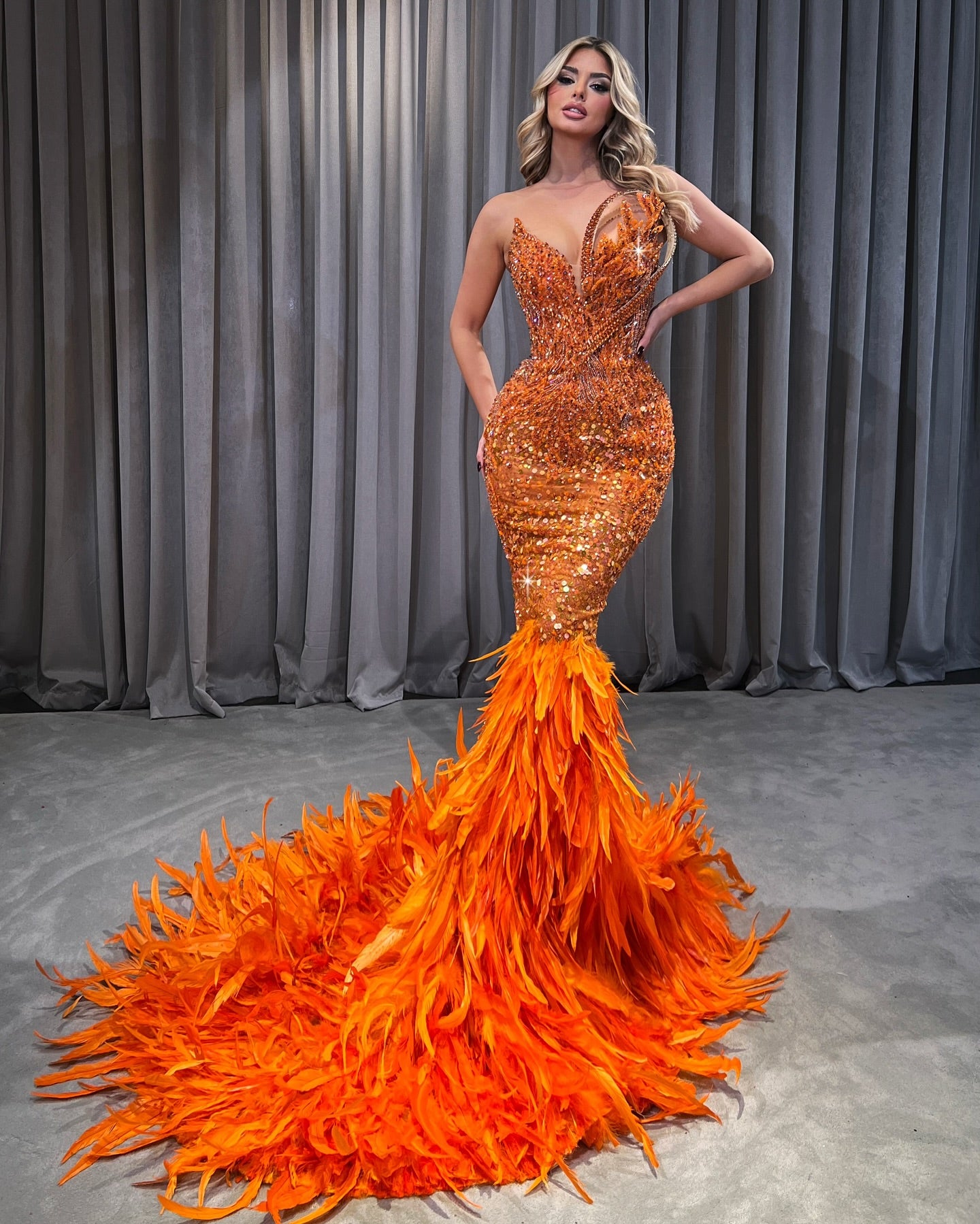 Orange feather sequin prom gown with sparkling sequins and elegant feather details.