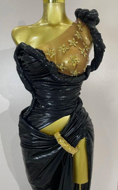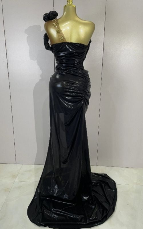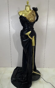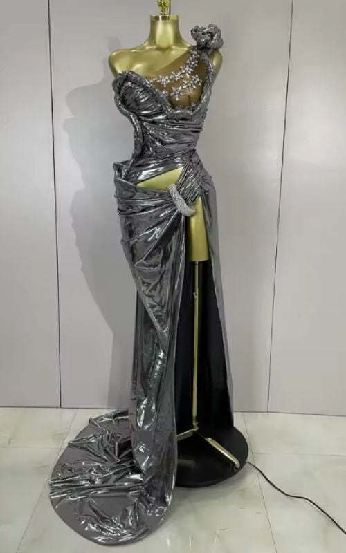 A dramatic high split adds movement and confidence, balancing sophistication with a modern, statement edge. The figure hugging fit enhances curves, making it perfect for formal events, red carpet moments, evening parties, and special celebrations.