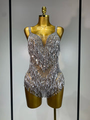 Anne Sparkly Rhinestones Sequins Tassel Sexy See-Through Bodysuit