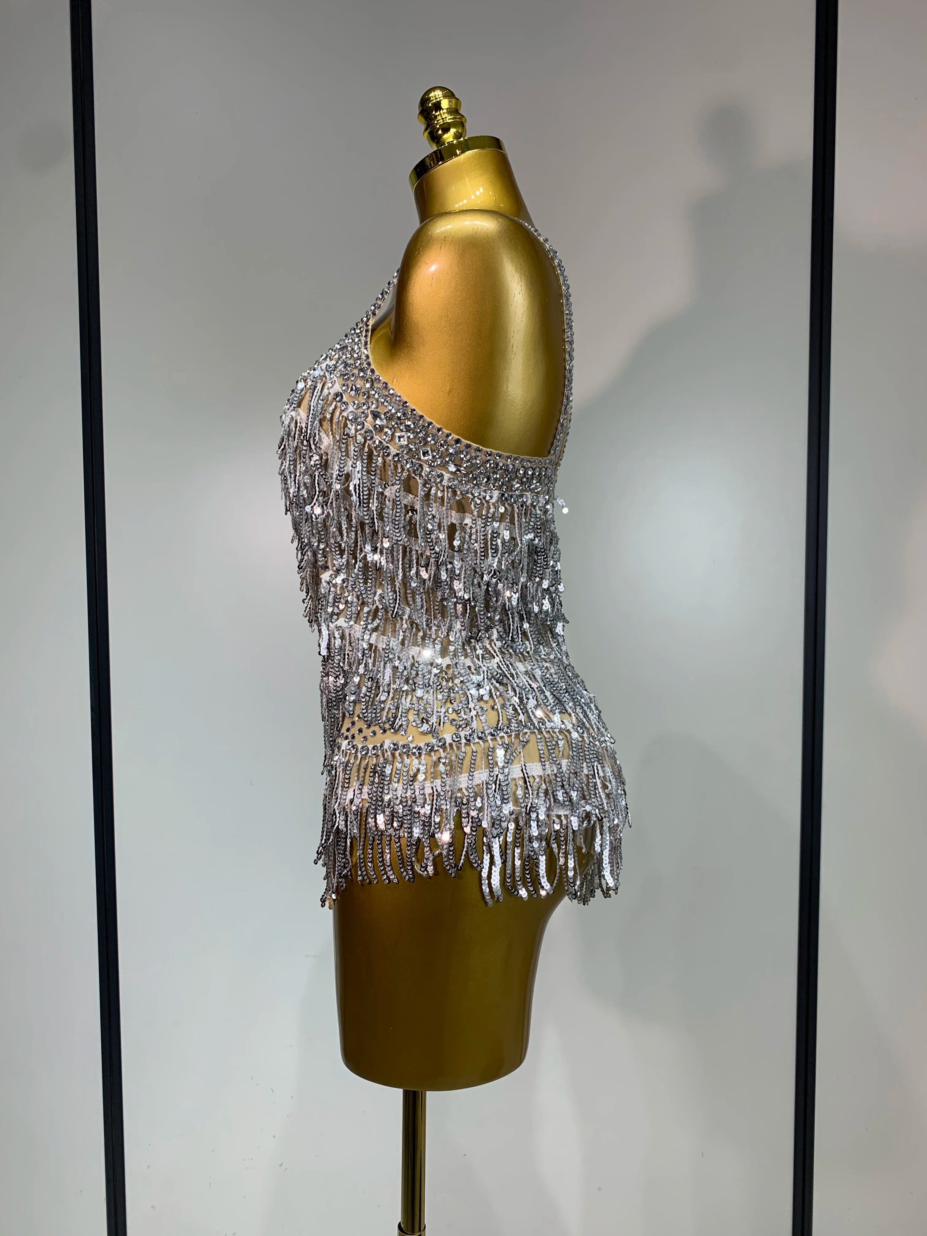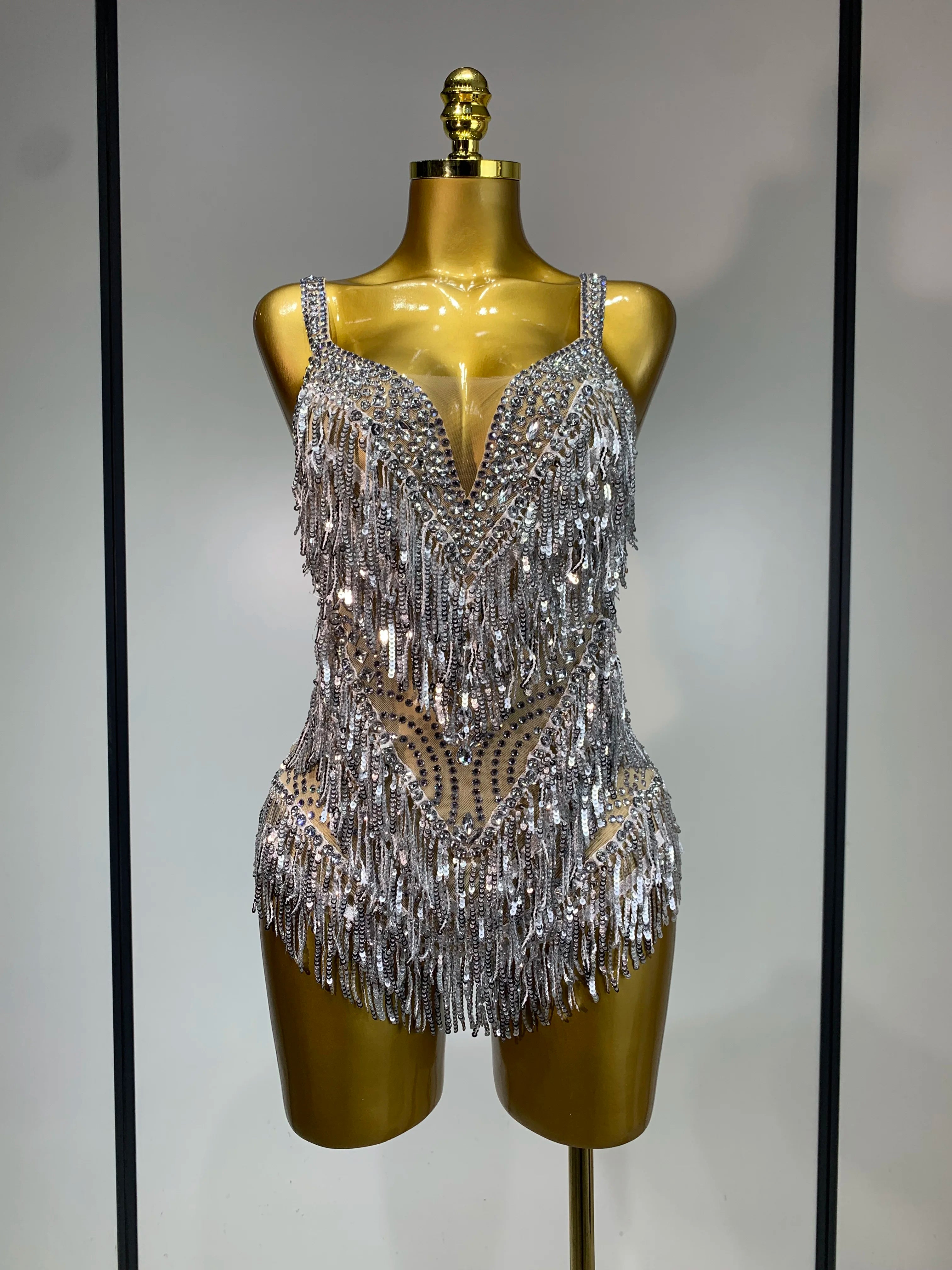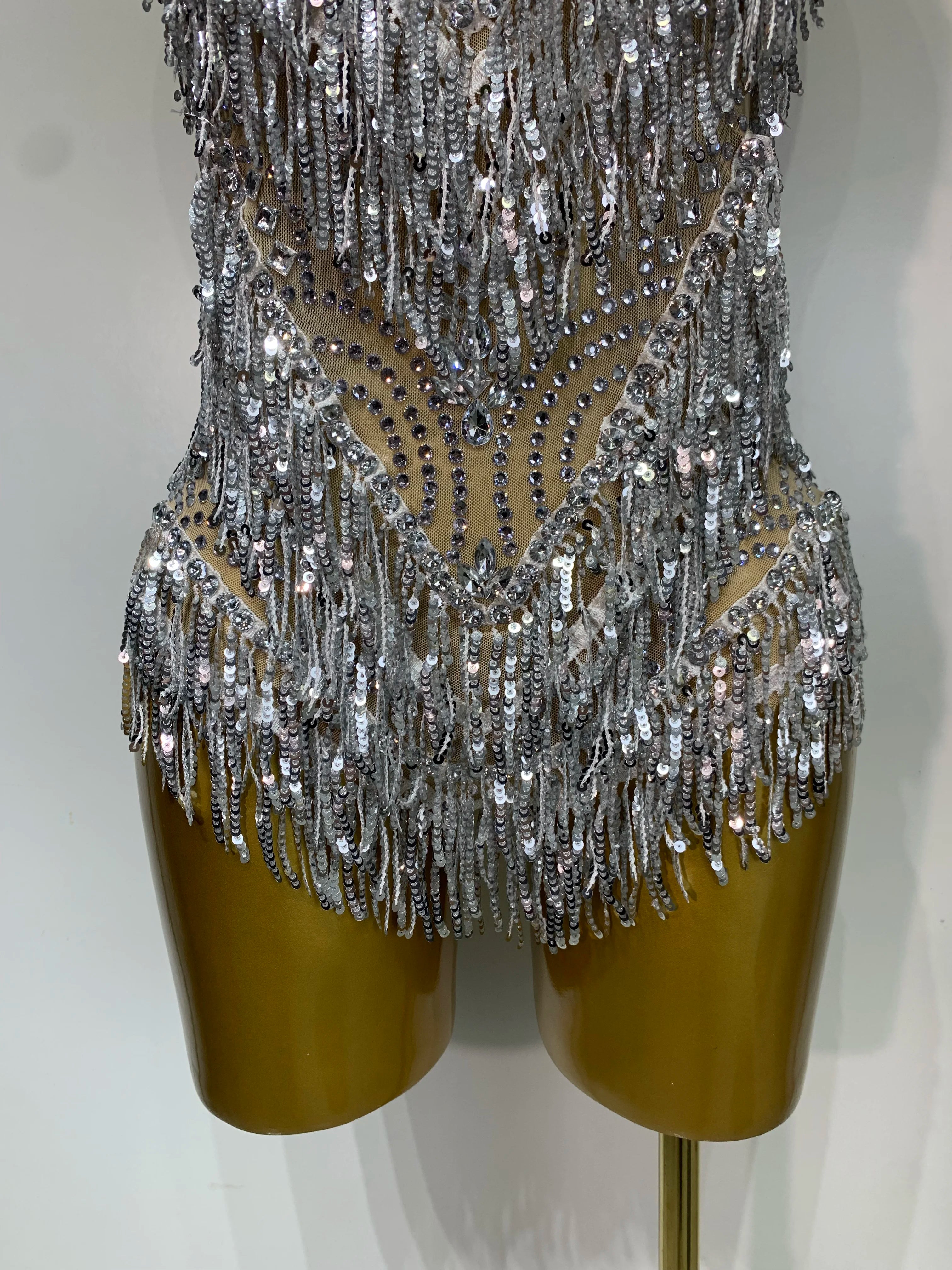 Anne sparkly rhinestones sequins tassel see through bodysuit