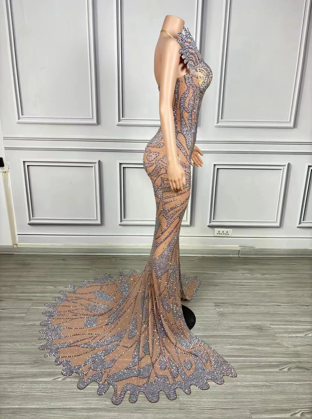 Featuring a daring strapless neckline, this sheath fishtail dress sculpts your figure before flaring dramatically at the hem. A provocative high slit adds a truly sexy element, allowing for movement and showing off your legs. Whether for prom, a pageant, or a luxury evening event, this diamond-encrusted fishtail gown offers unmatched glamour and sophistication. It is the ultimate statement piece in formal fashion.