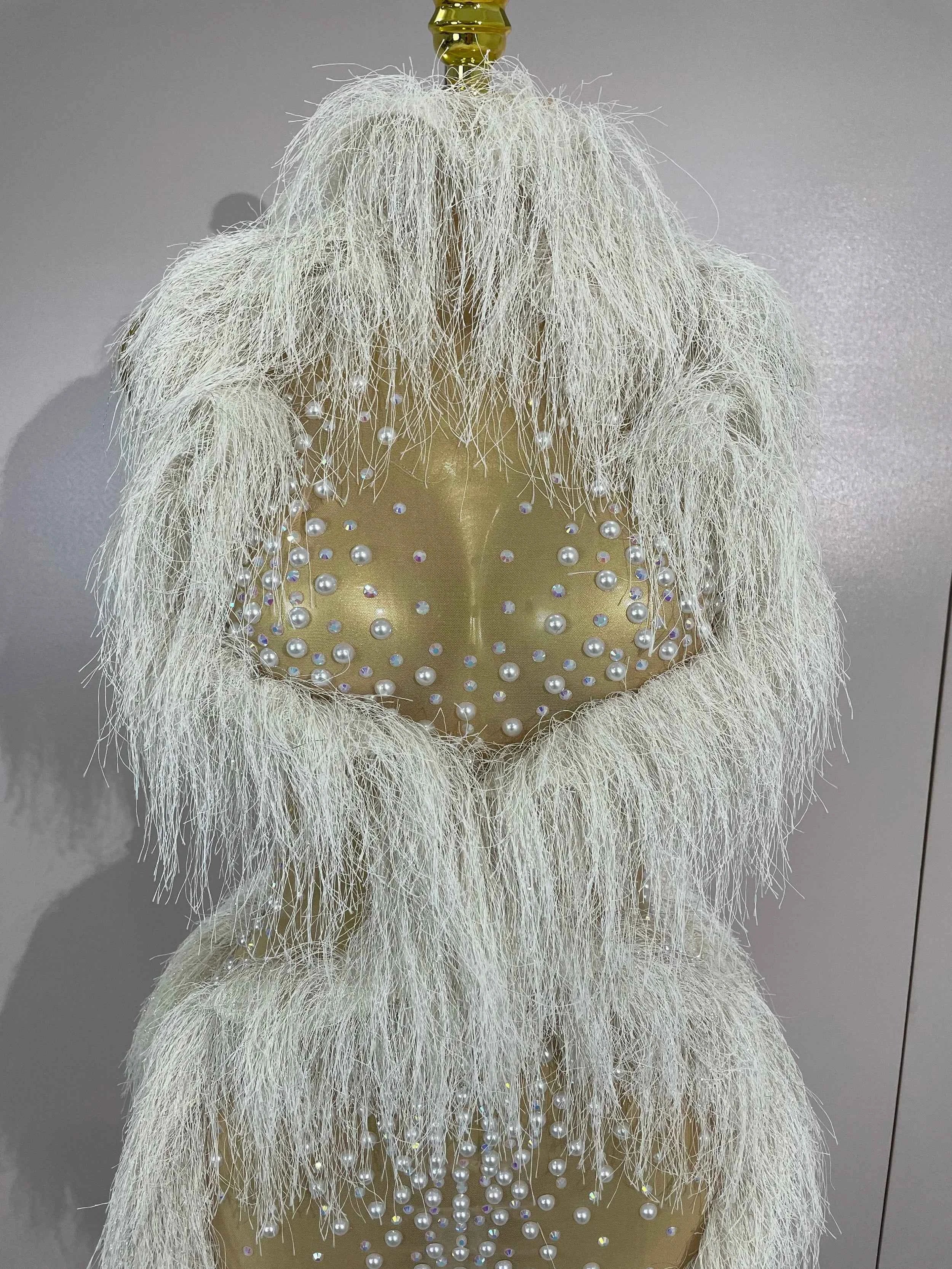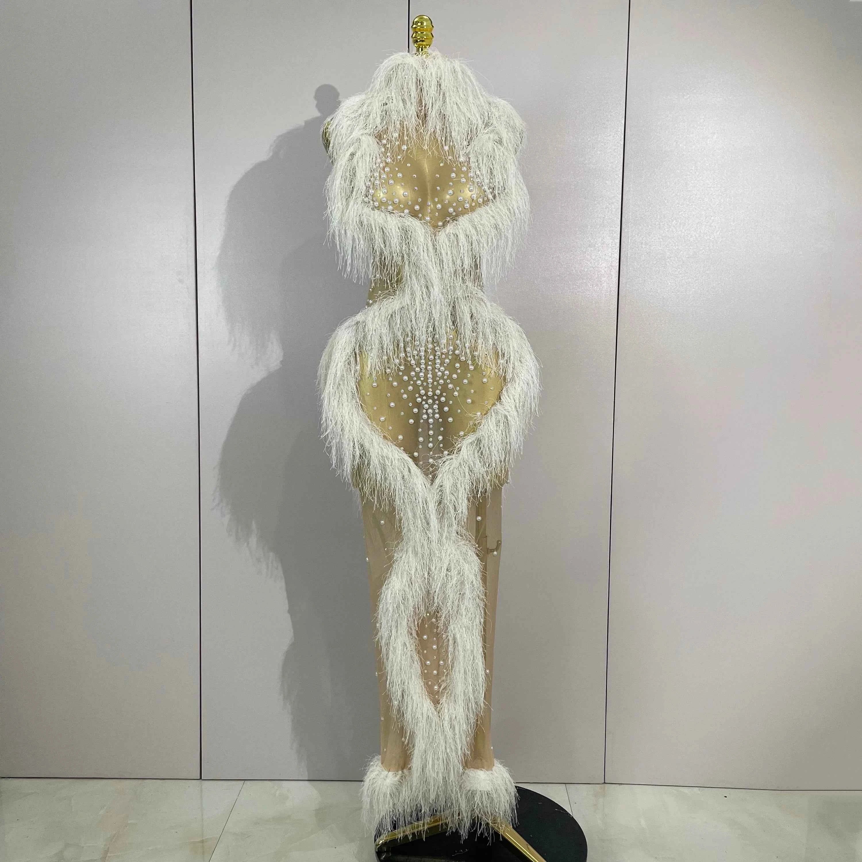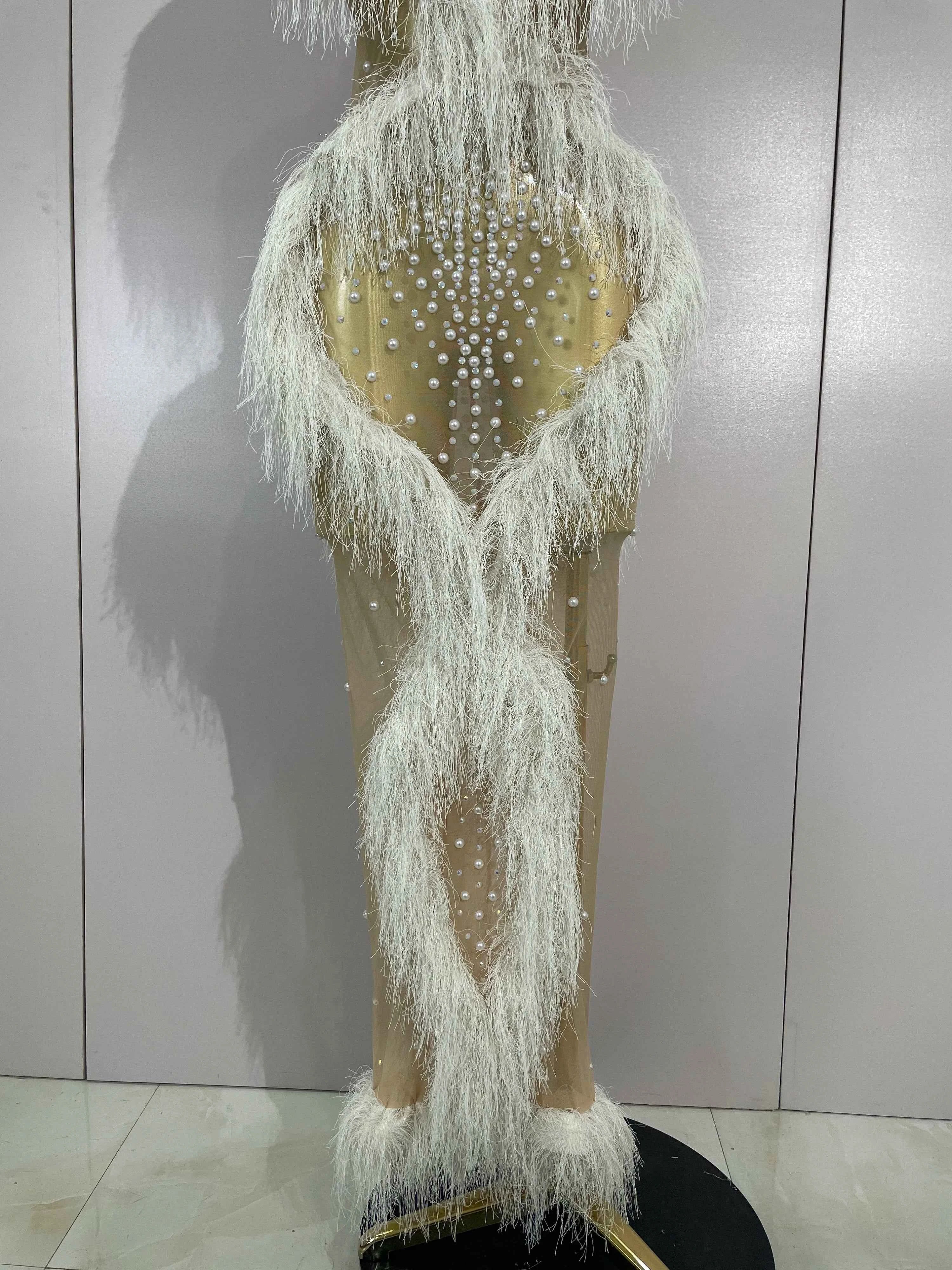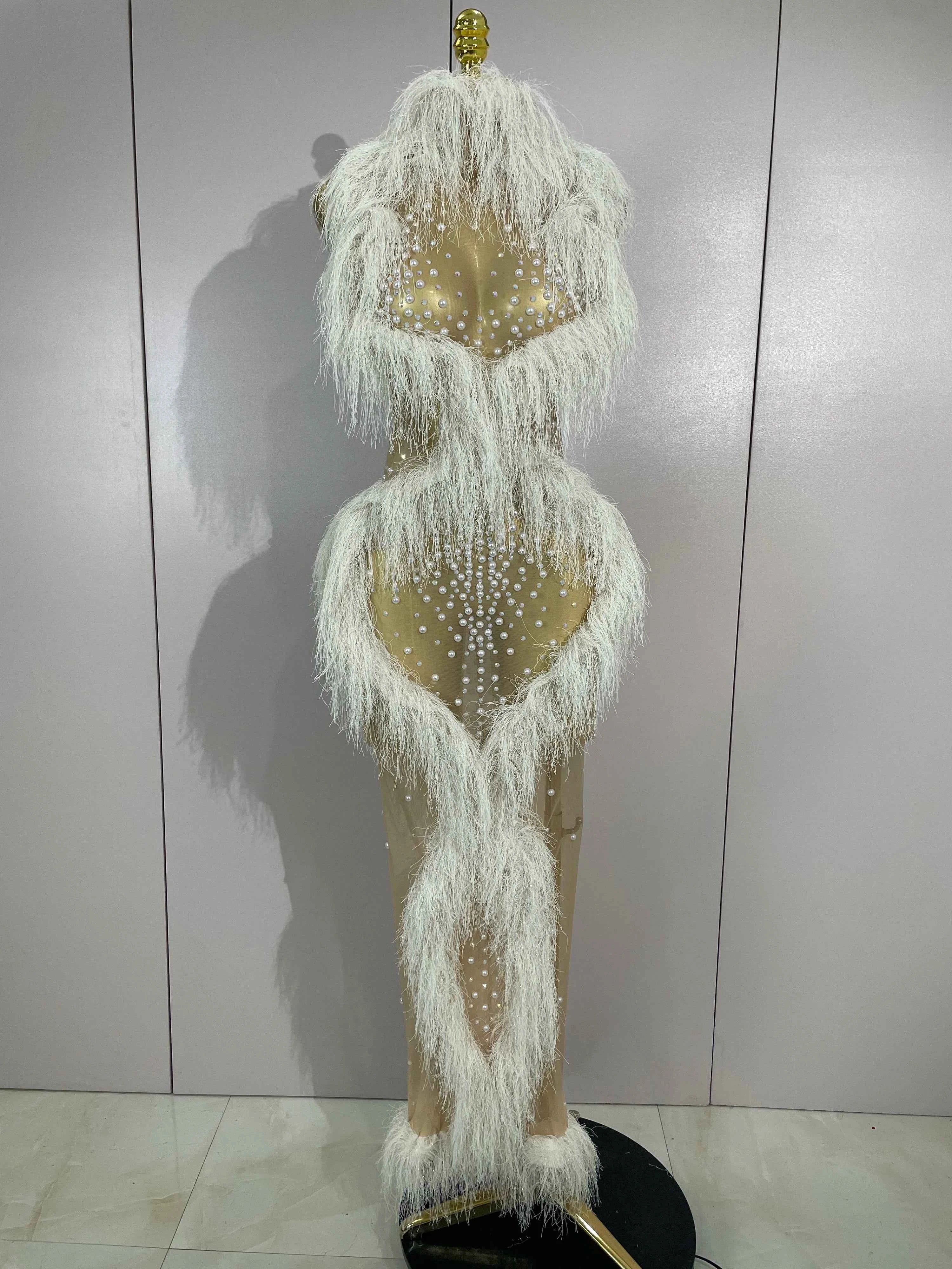 2026 New Sparkly Pearl Tassel Mesh See Through Long Dress Women Sexy Luxury Birthday Prom Party Nightclub Singer Stage Costume