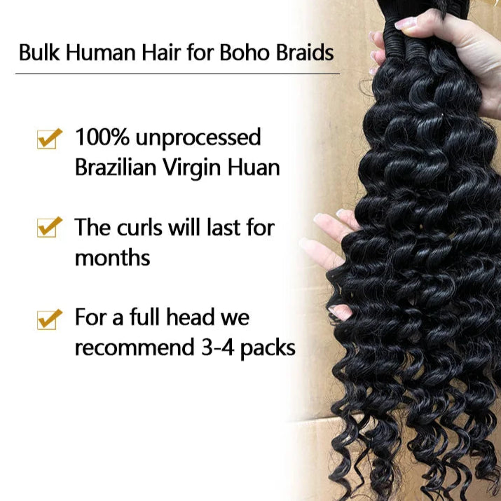 Curly deep wave bulk human hair – 100% Brazilian hair for braiding, no weft extensions, perfect for Malaysian boho braids with natural curls