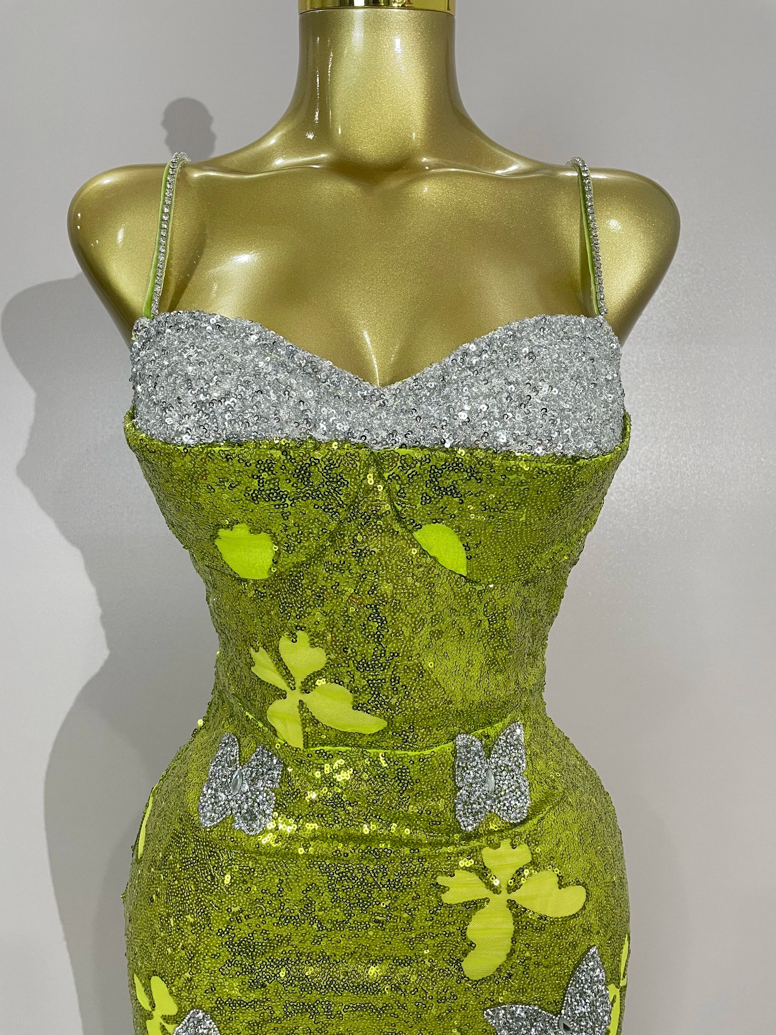 Liora butterfly crystal sexy halter green bodycon long dress with crystal details and slim-fit design.