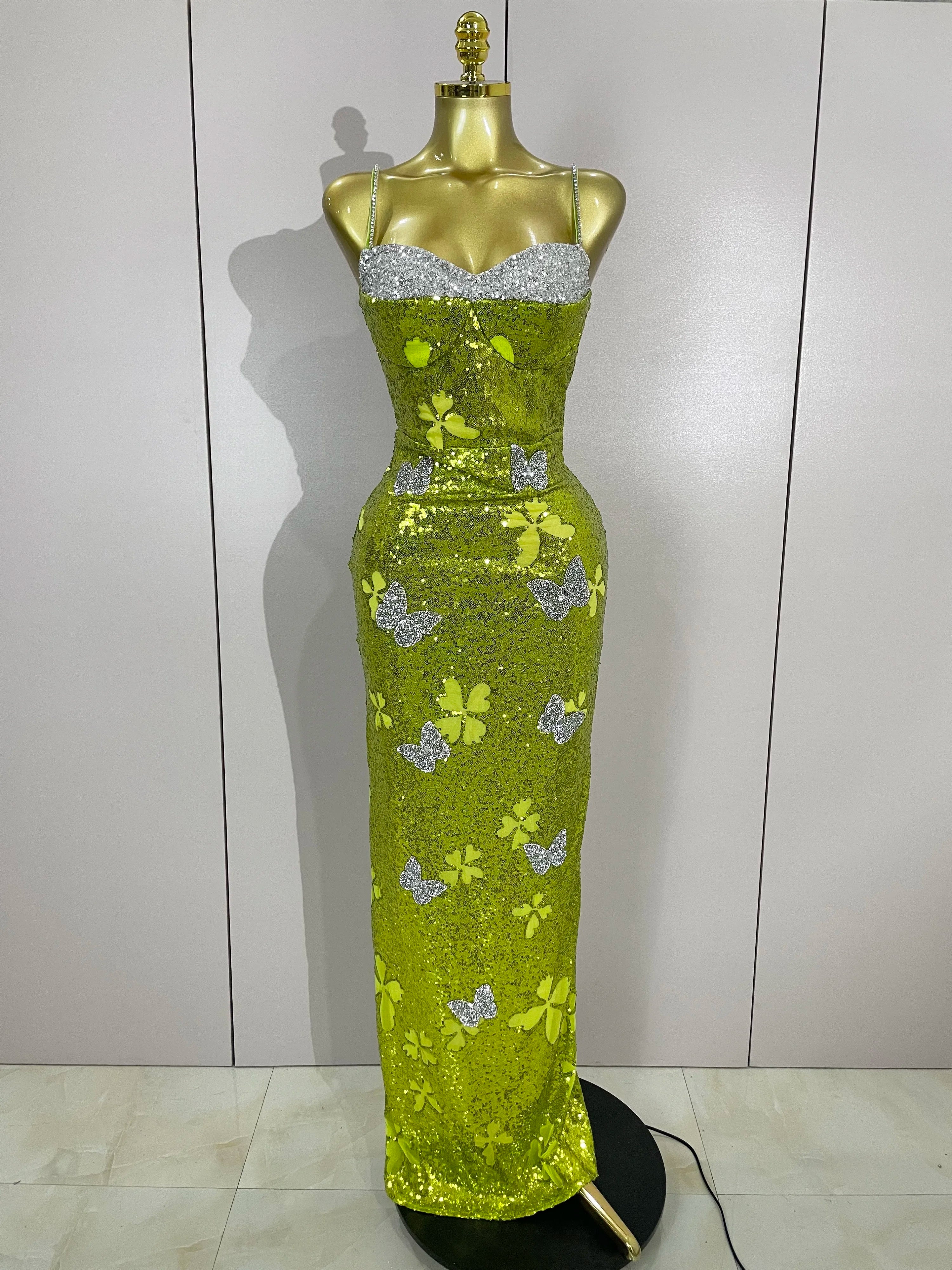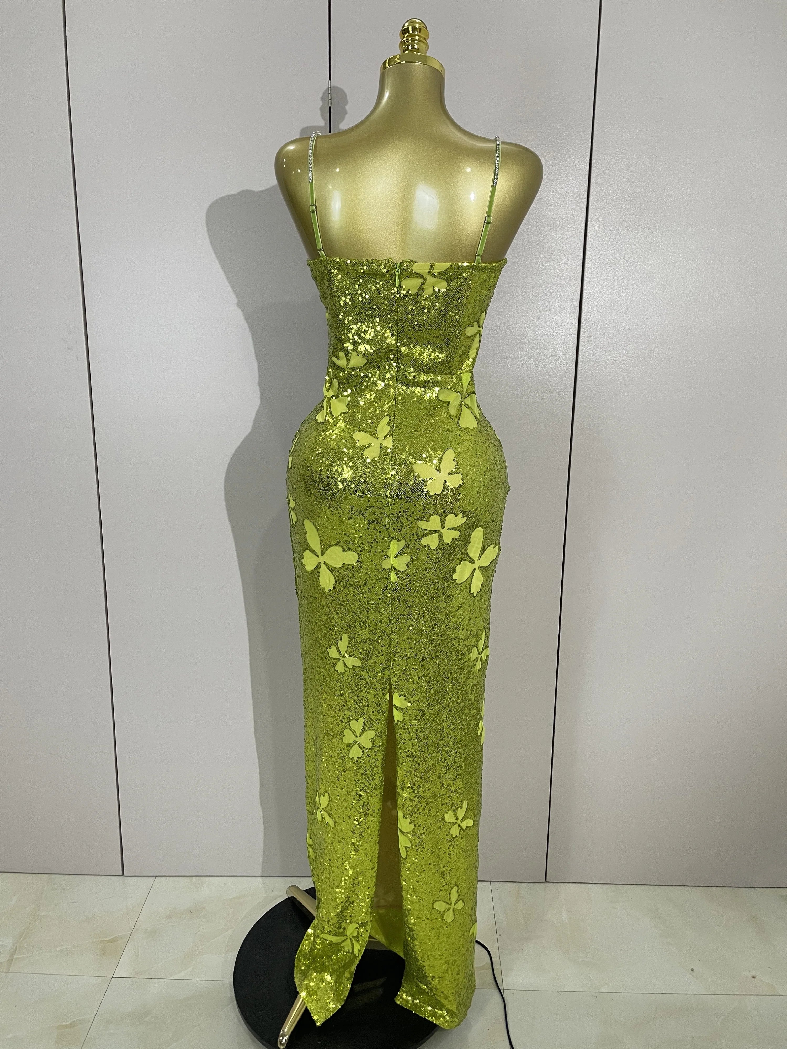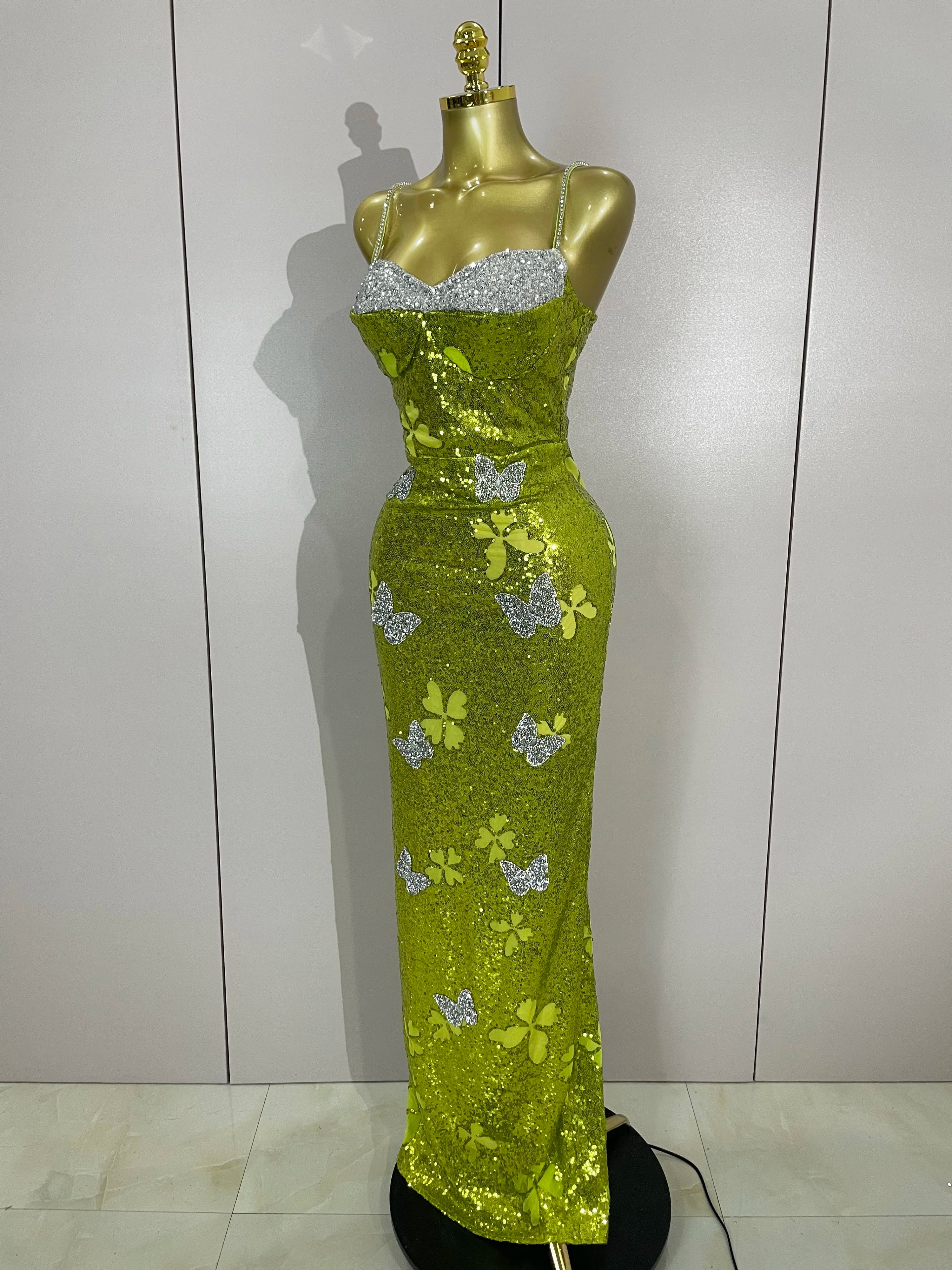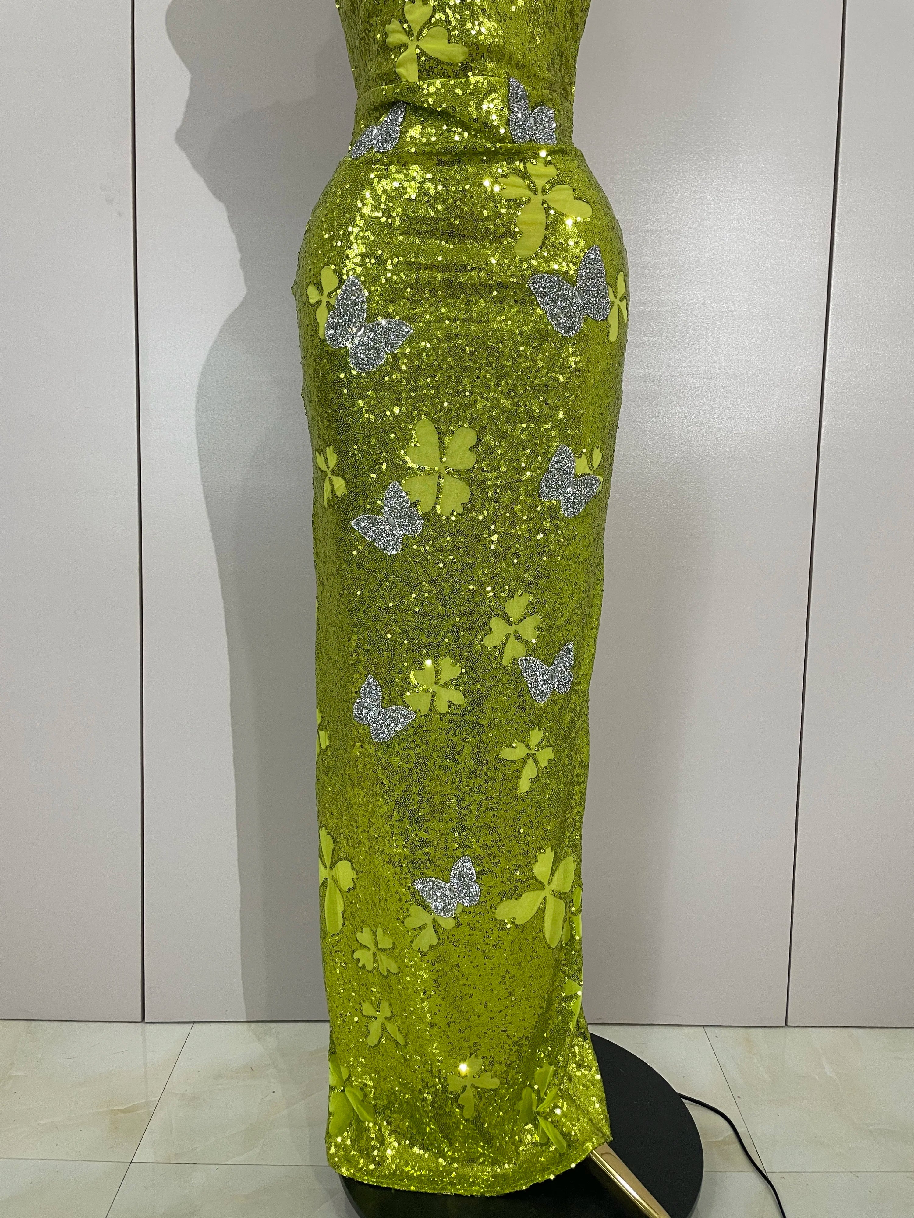 Stand out in the Liora butterfly crystal sexy halter green bodycon long dress. This captivating gown features sparkling crystal butterfly accents, a daring halter neckline, and a curve-hugging slim silhouette. Perfect for galas, birthdays, and glamorous evening occasions.