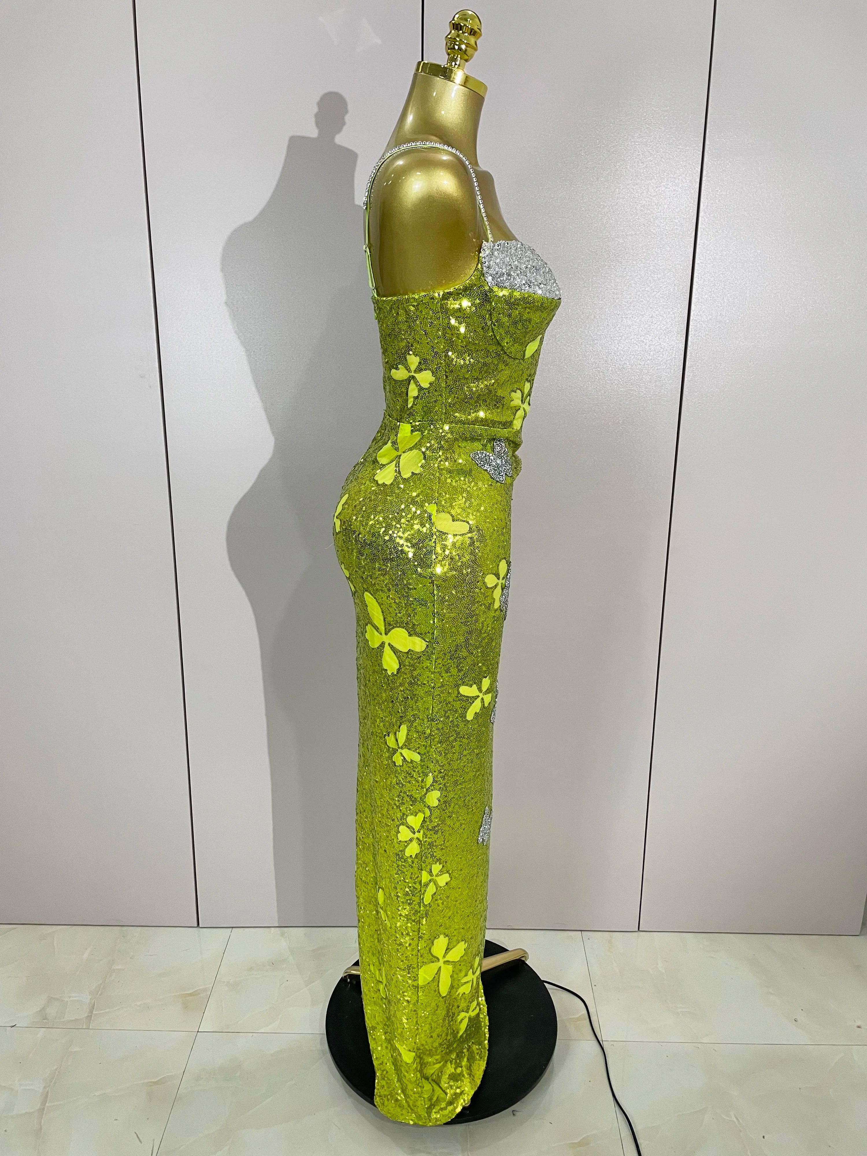 Liora Butterfly Crystal Sexy Halter Green Bodycon Long Dress