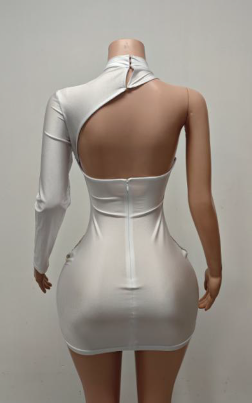 Silver rhinestone one-shoulder mini dress with sparkly detailing for party and nightlife wear.