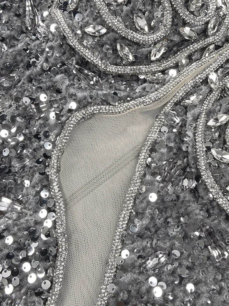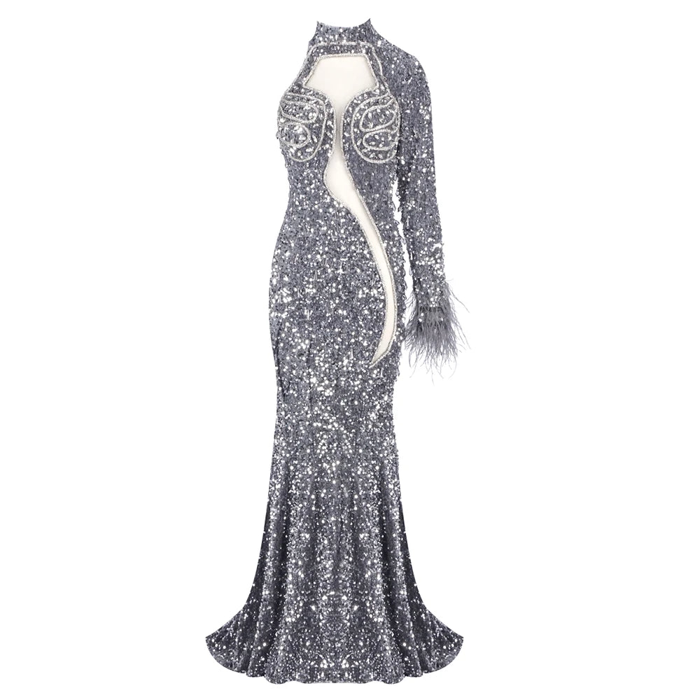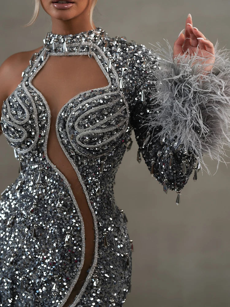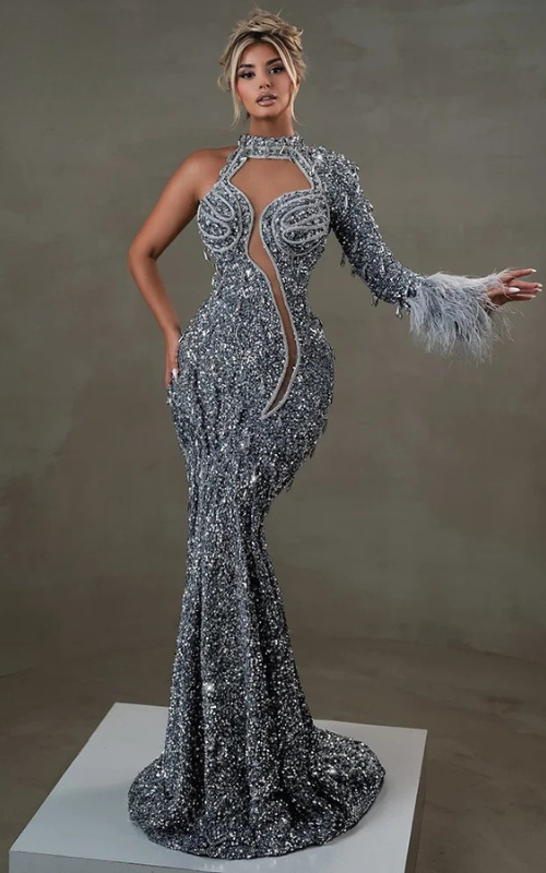 Turn every moment into a spotlight with the Amara One-Shoulder Gray Sequin Gown, designed for elegance and allure. This exquisite long dress features sparkling sequins, soft feather details, and a chic one-shoulder silhouette that makes a bold fashion statement. Perfect for evening parties, galas, and formal celebrations, this gown offers sophistication, glamour, and a flawless fit.