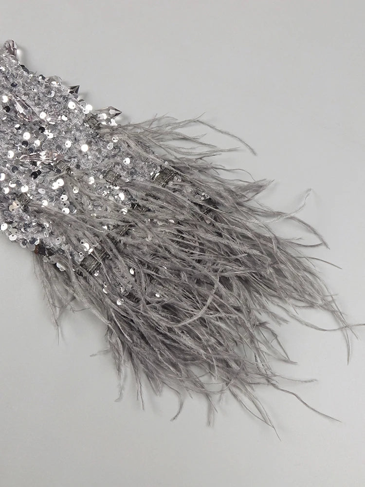 Nevaeh One-Shoulder Gray Sequin Gown with Feathers