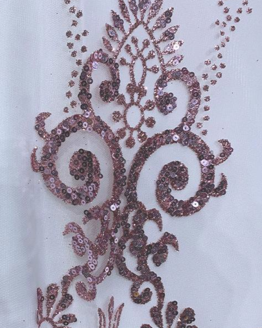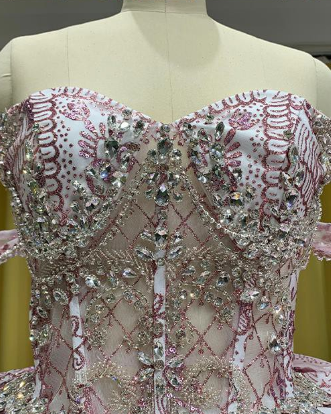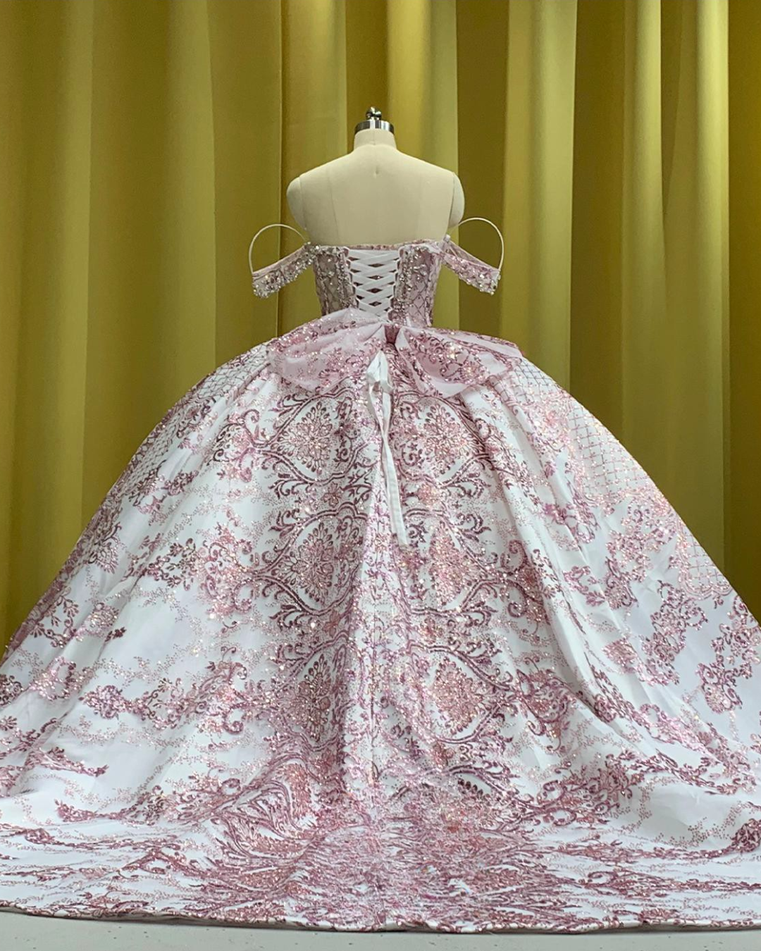 This quinceañera ball gown features an off shoulder neckline paired with a white and rose gold palette for a soft, regal look. The crystal embellished bodice adds a radiant shine, while the full layered skirt creates classic princess volume. Designed for grand celebrations, this gown brings elegance, sparkle, and a timeless fairytale feel to the birthday moment.his gown brings elegance, sparkle, and a timeless fairytale feel to the birthday moment.