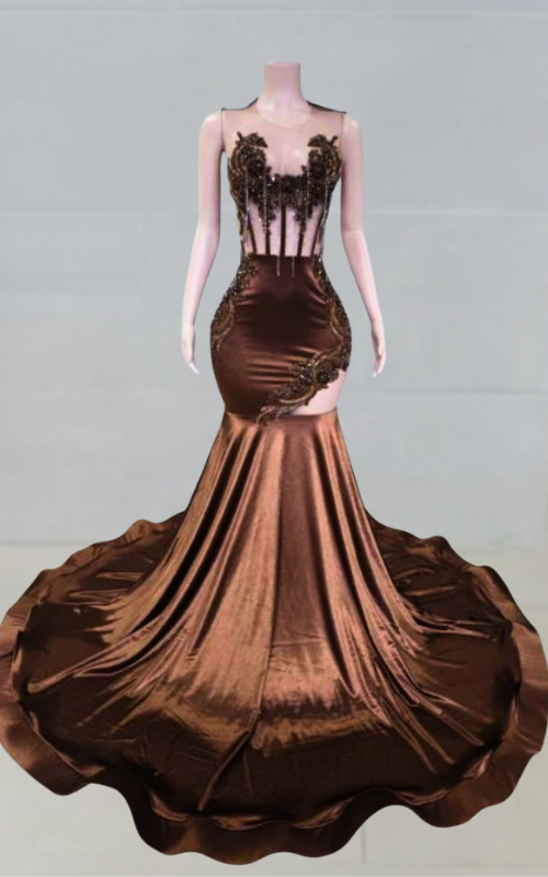 Shaine is sleek, sculpted, and effortlessly luxe. This Brown Strapless Sheer Mesh Mermaid Gown features a clean strapless neckline, sheer mesh detailing, and a flattering mermaid silhouette that elongates the body. Understated yet powerful, it’s perfect for prom night, formal events, galas, or any moment that calls for confident elegance without the extra noise.