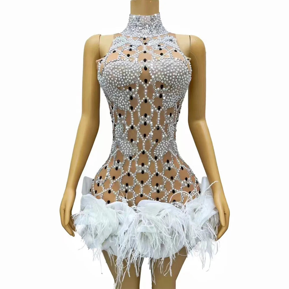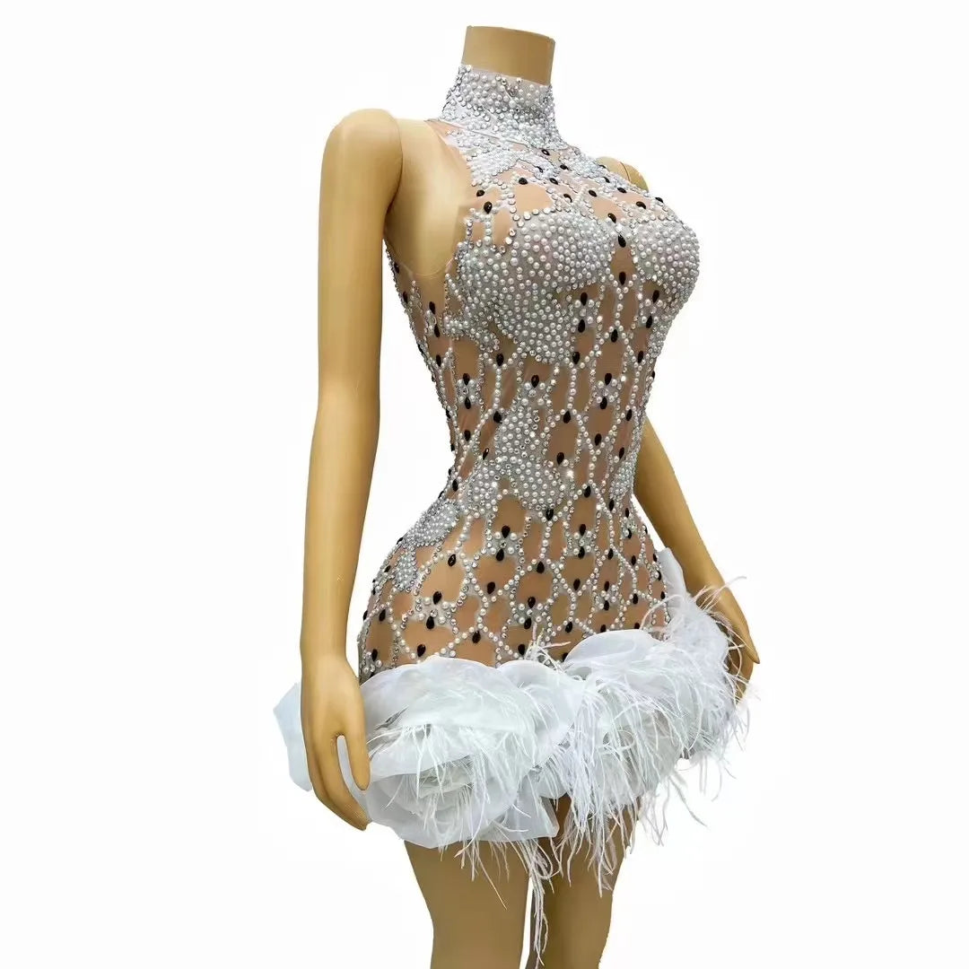 Teyana Handmade Shining Rhinestone Pearl Feather Lace Dress