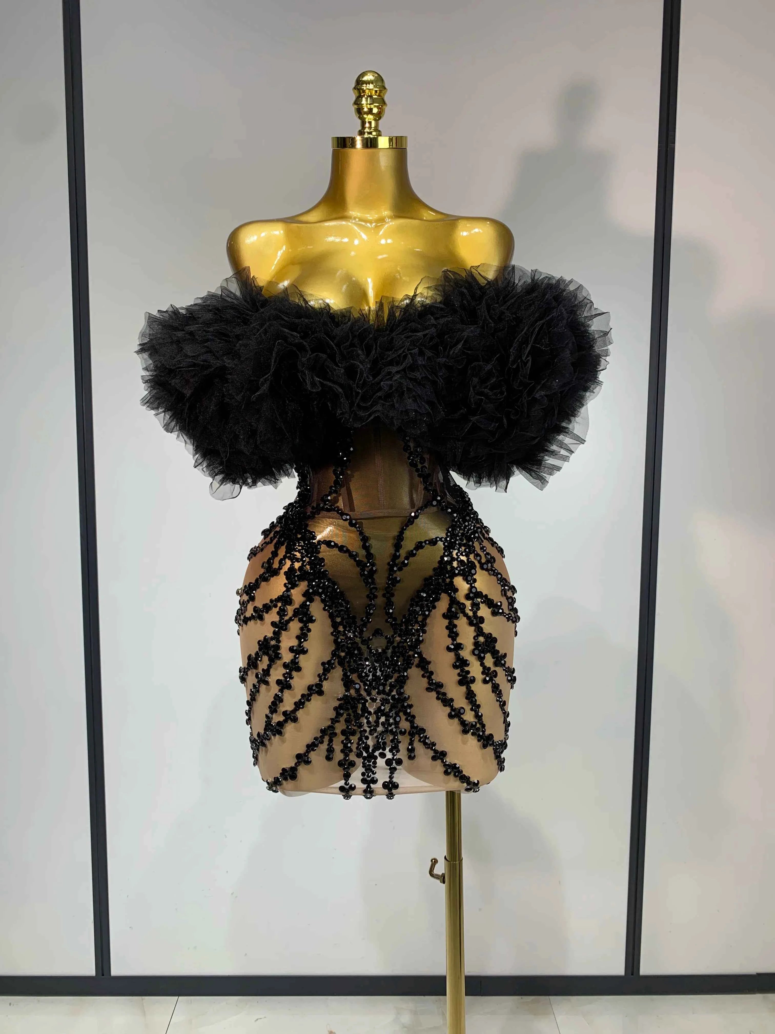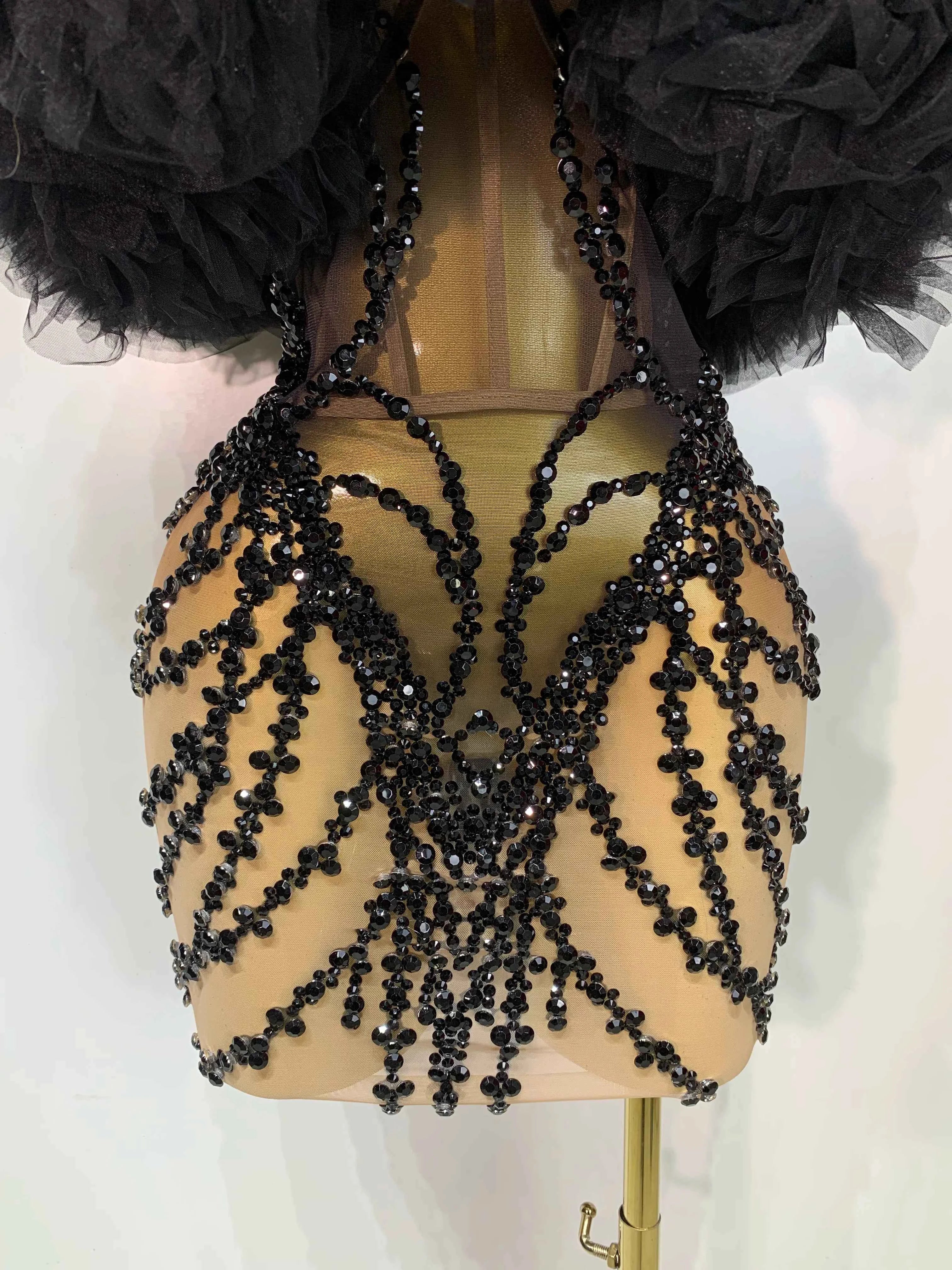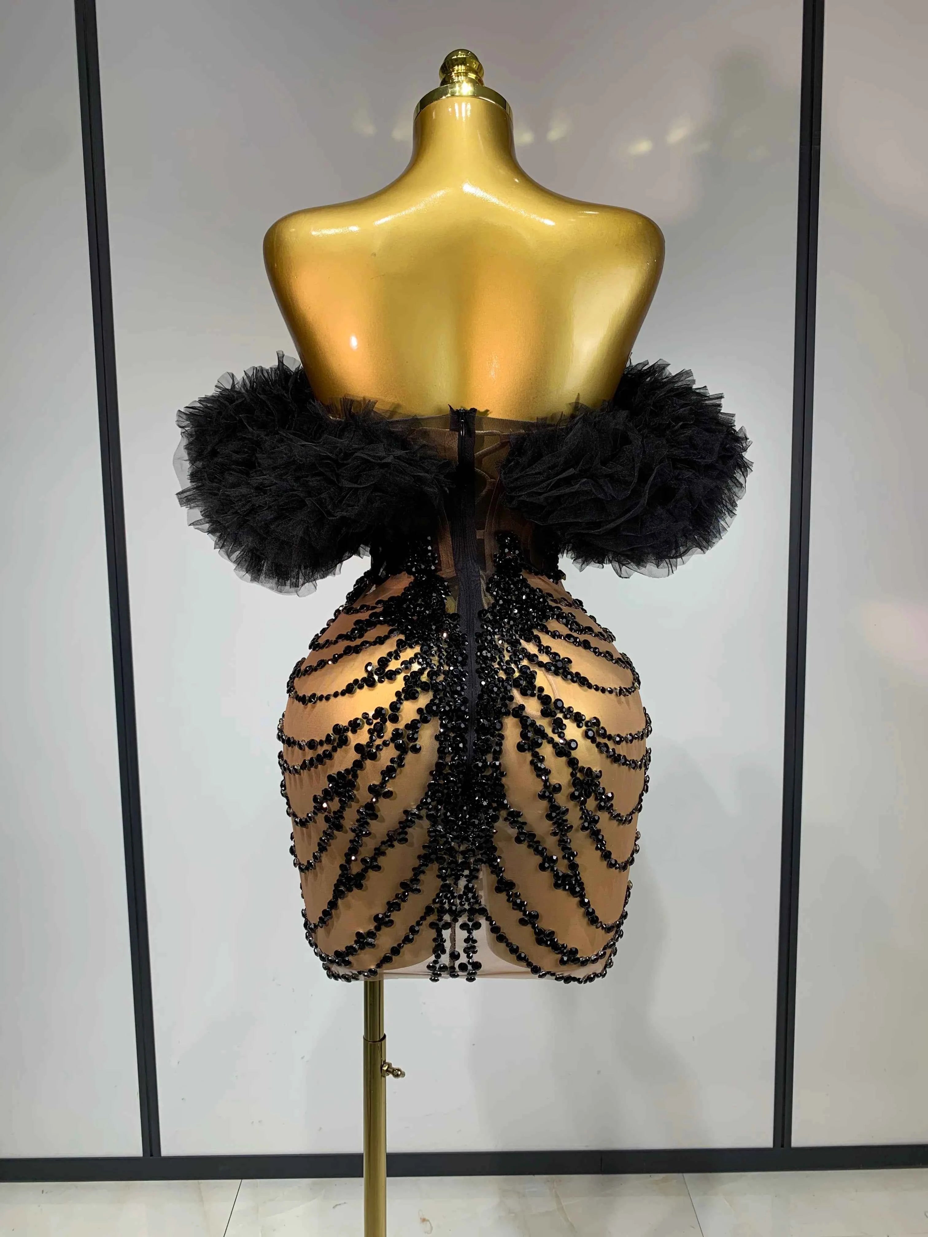 Women Sexy Strapless Backless Black Diamond Mini Dress Evening Party Birthday Costume Nightclub Singer Stage Performance Costume
