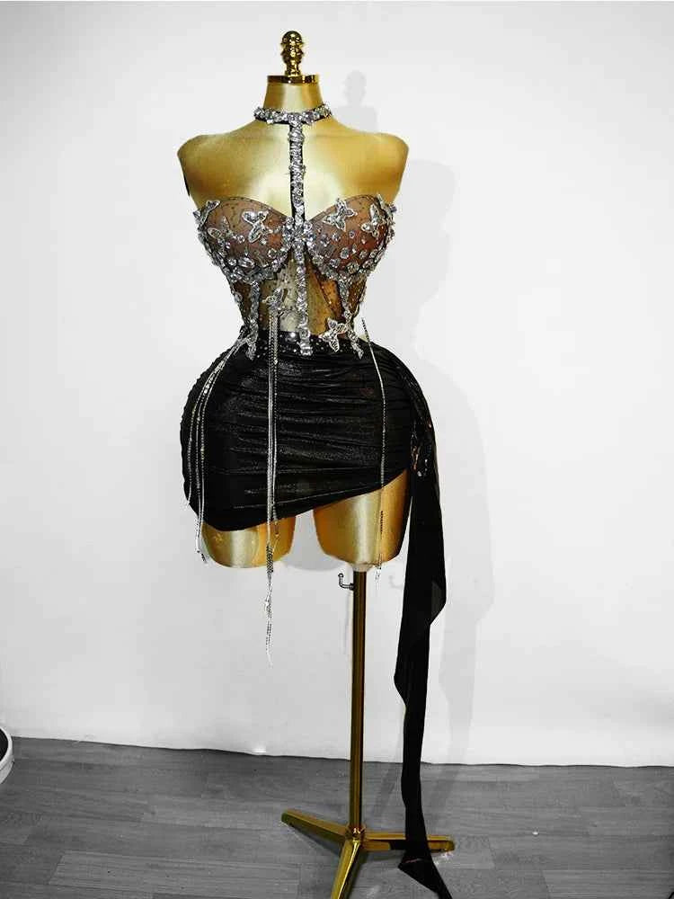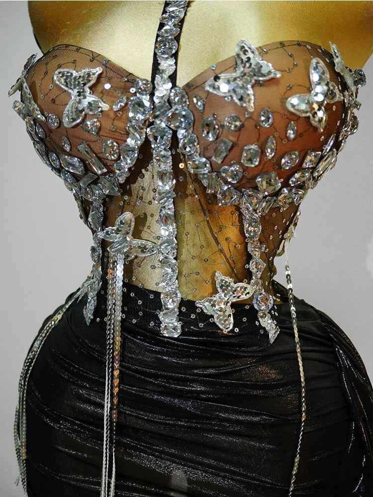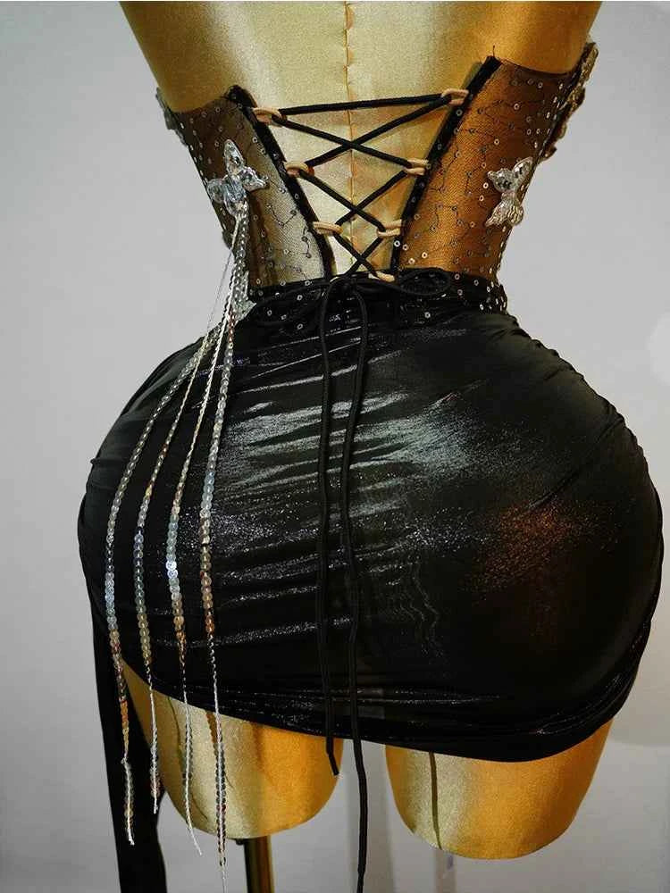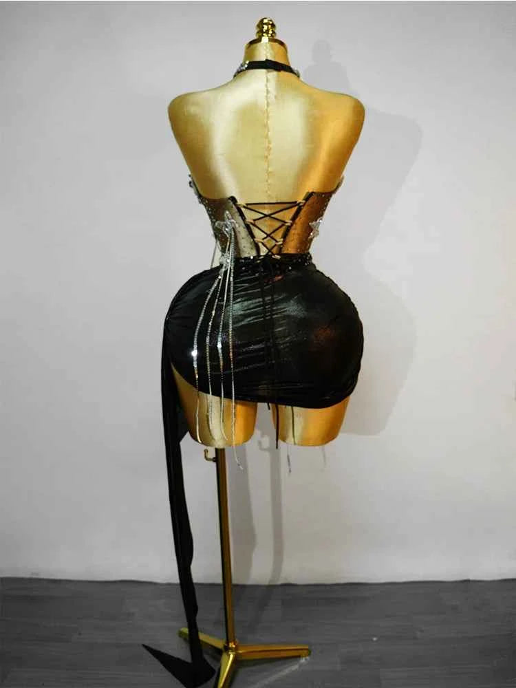 black 2 Piece sets Sequin Dress Crystal Tassel Sexy Club Stage Performance Celebrate Birthday Party Dance Clothing
