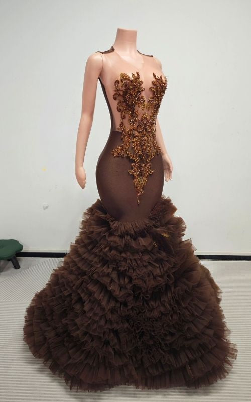 The fitted mermaid shape hugs the body before flaring into layered tulle, creating movement and balance. Intricate bronzed beadwork adds dimension and texture, catching light with a subtle glow that enhances the rich brown tone. The tiered tulle flare delivers volume and soft drama, turning every step into a cinematic moment.