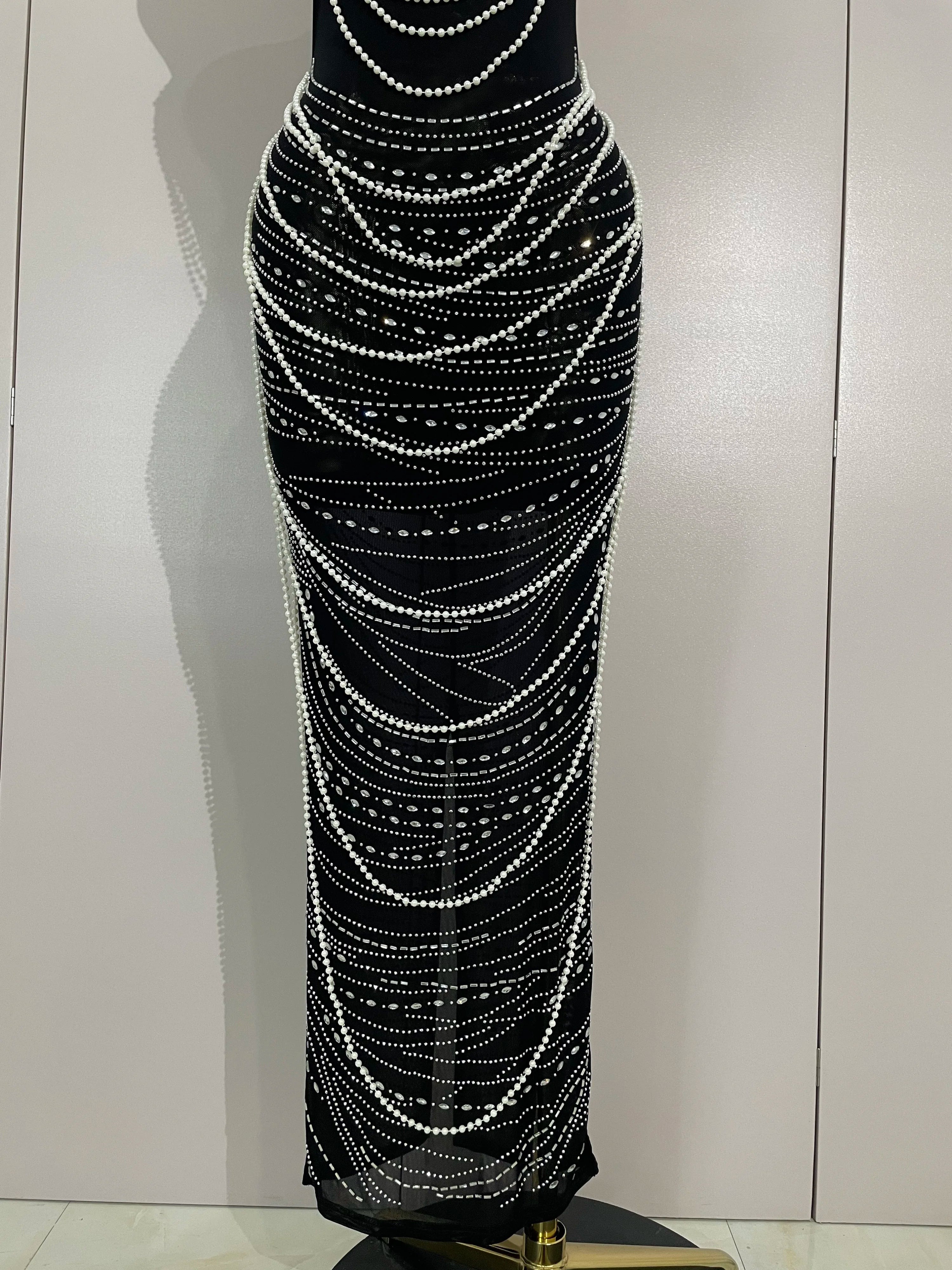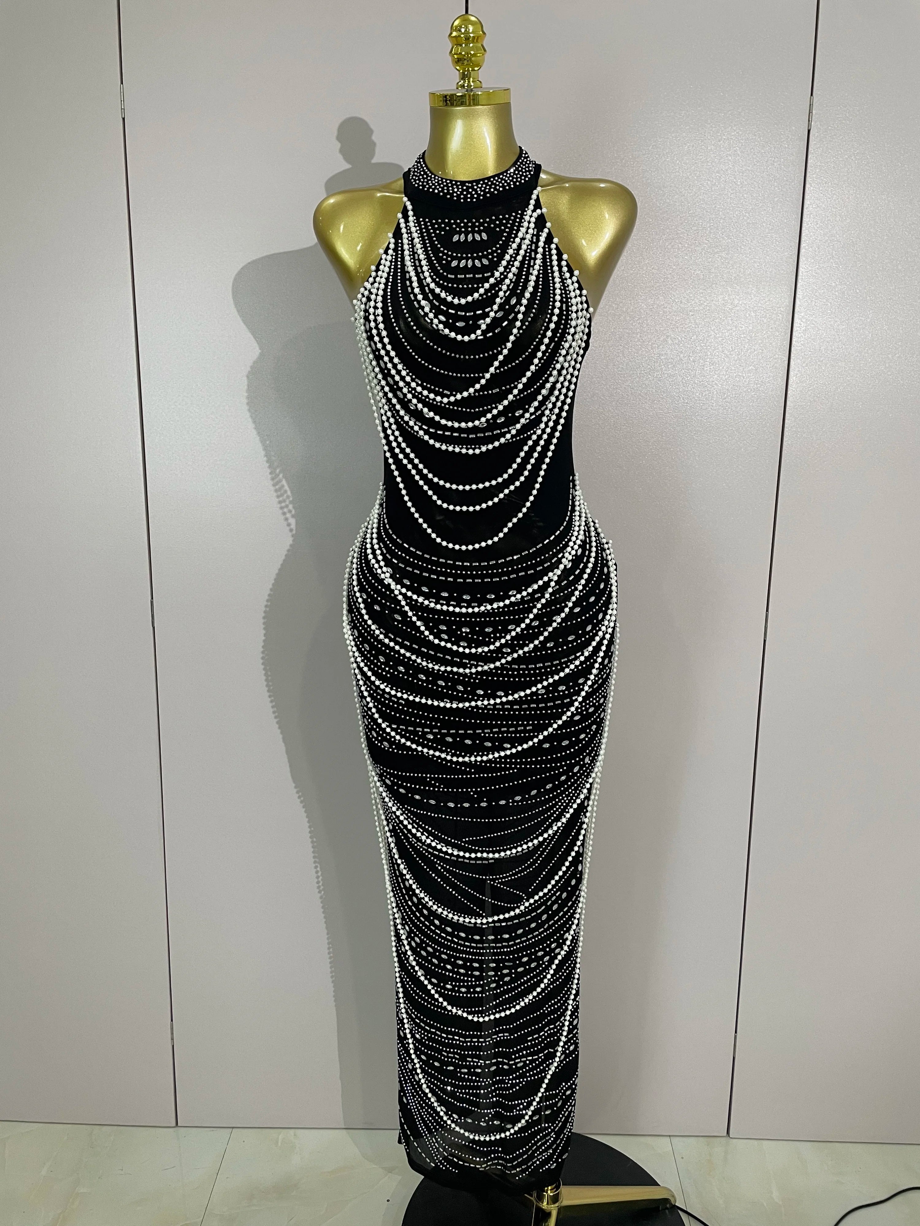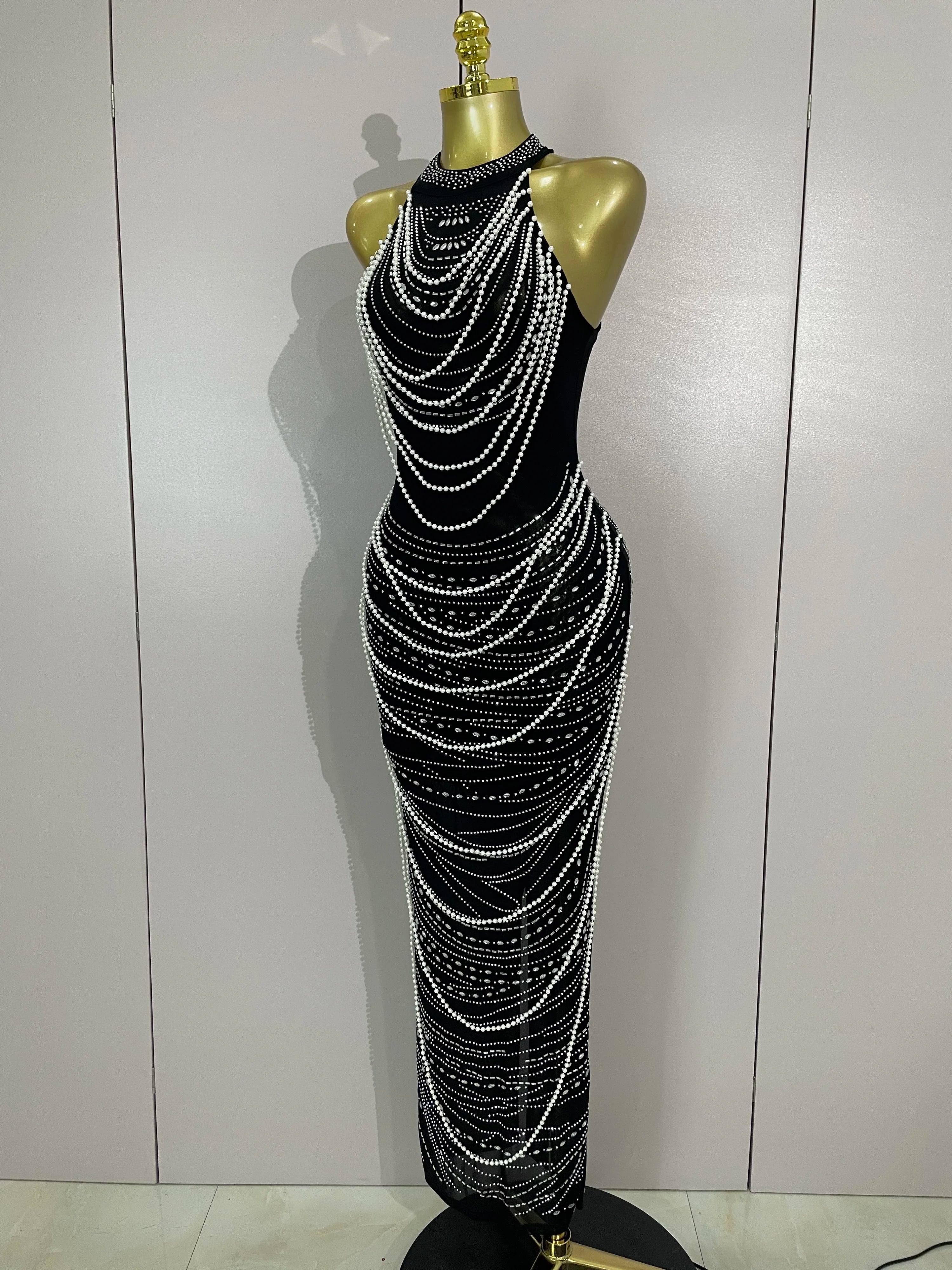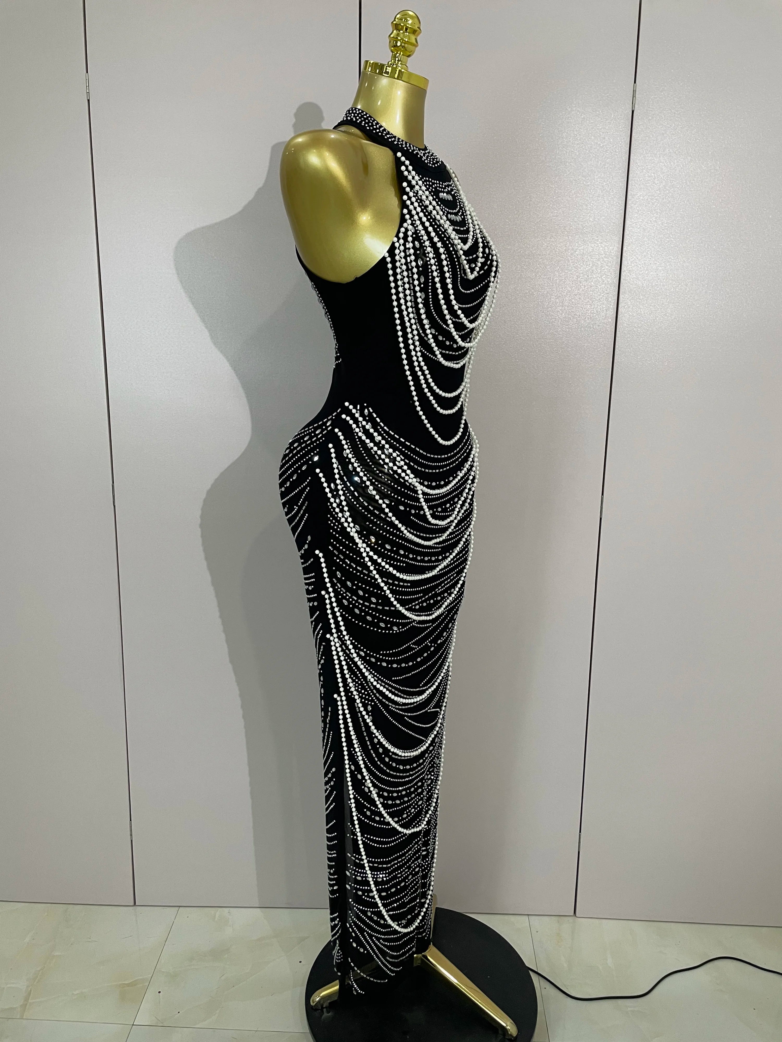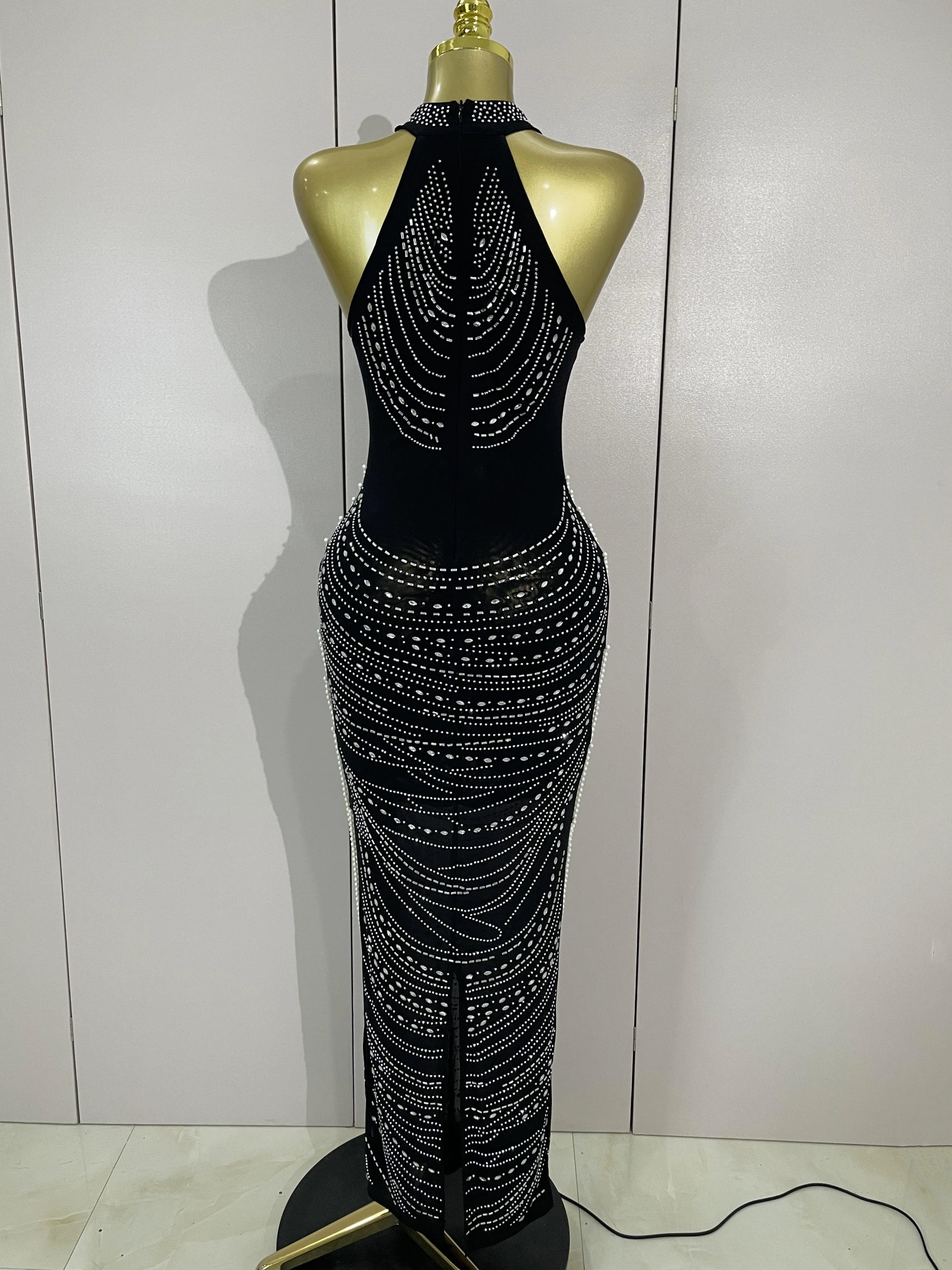 Candace elegant beaded diamond mesh sleeveless bodycon long dress for women’s evening or birthday celebrations.