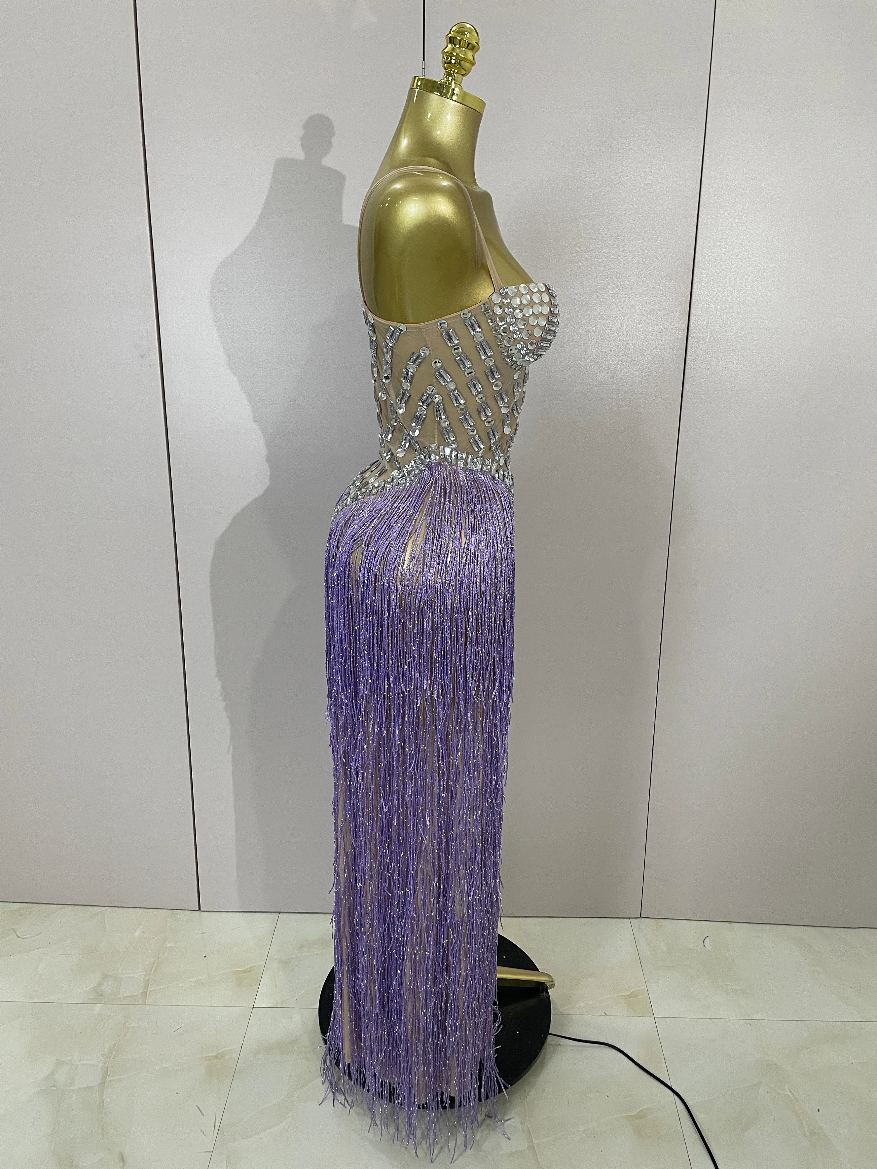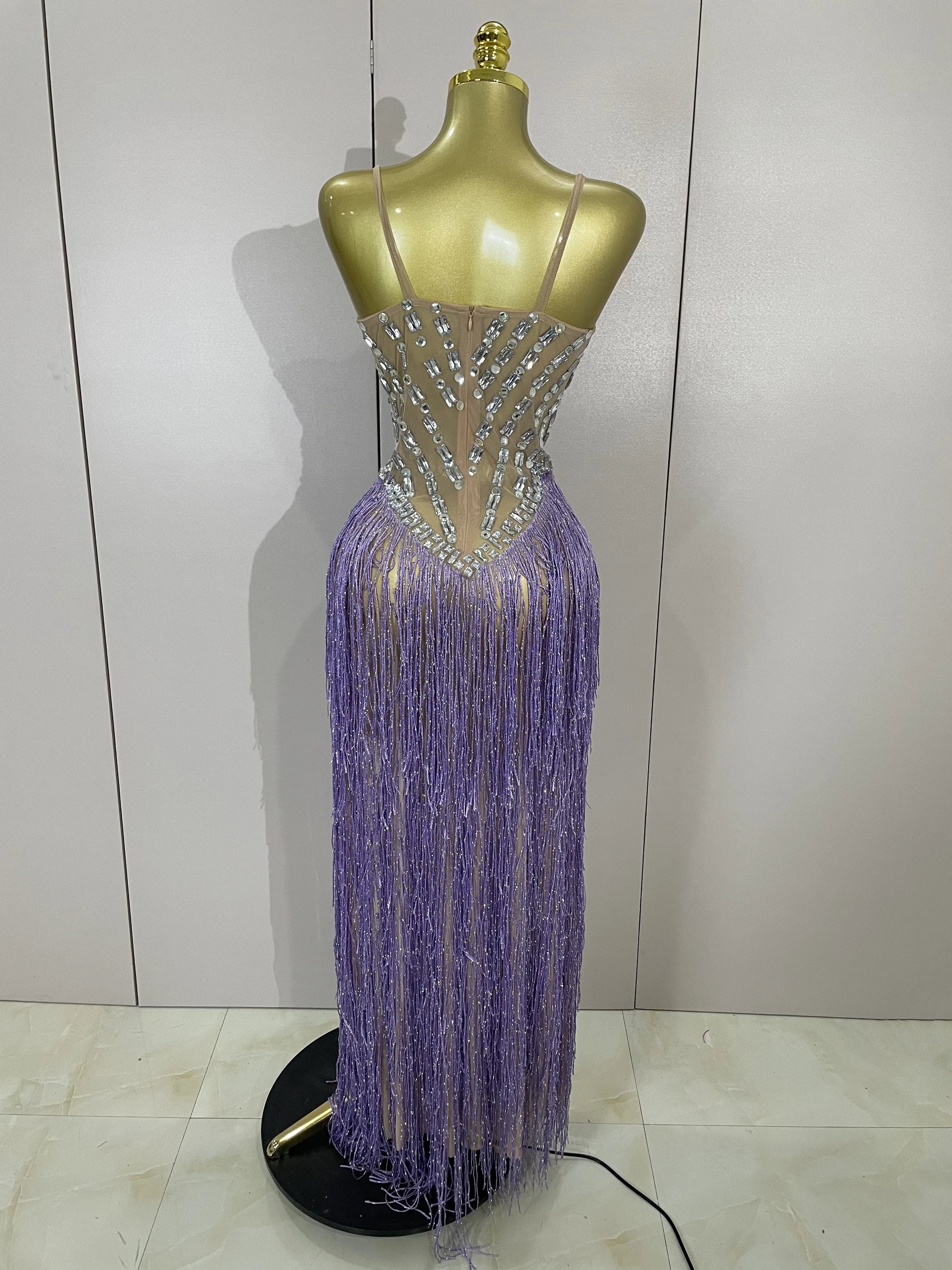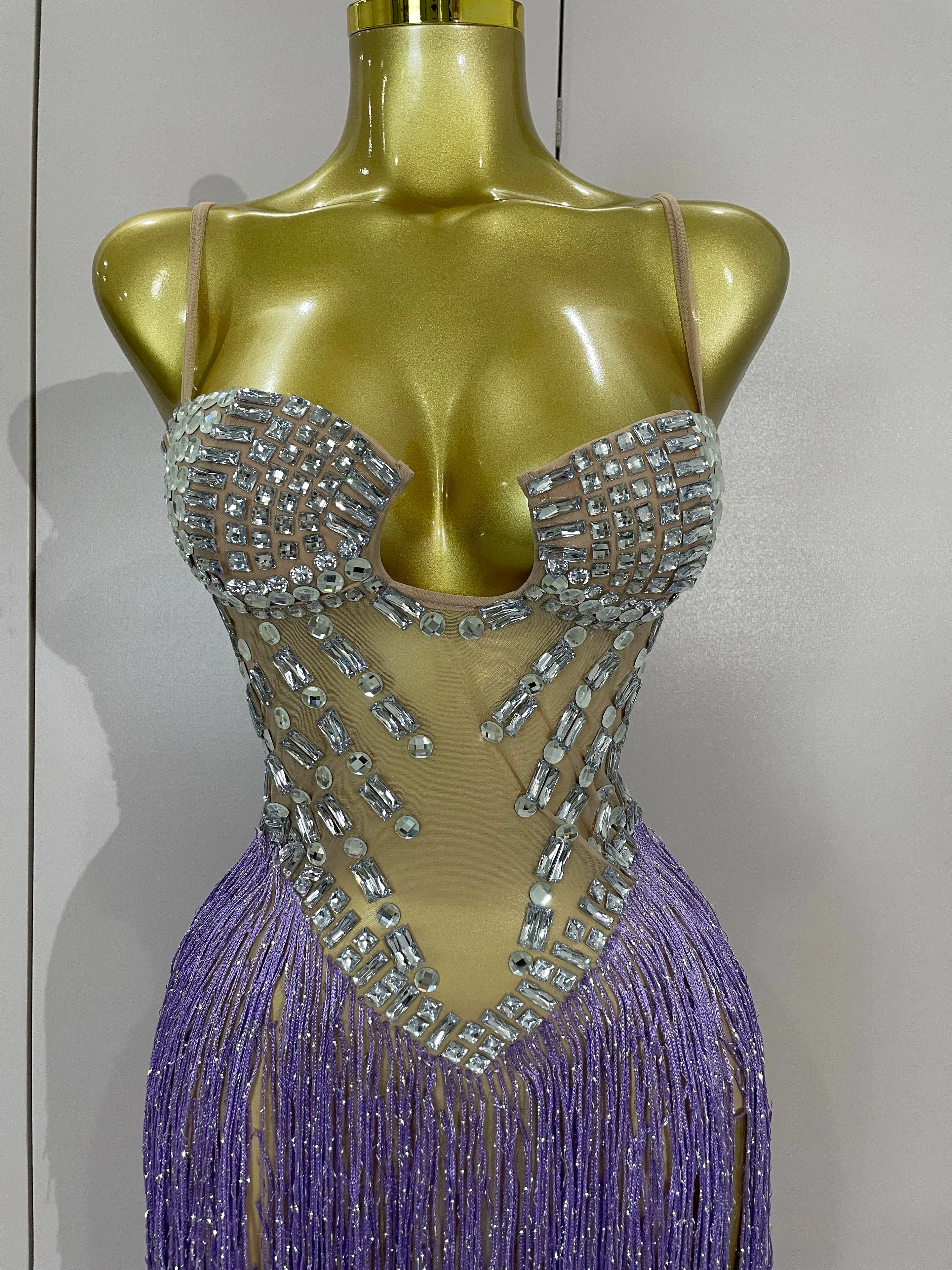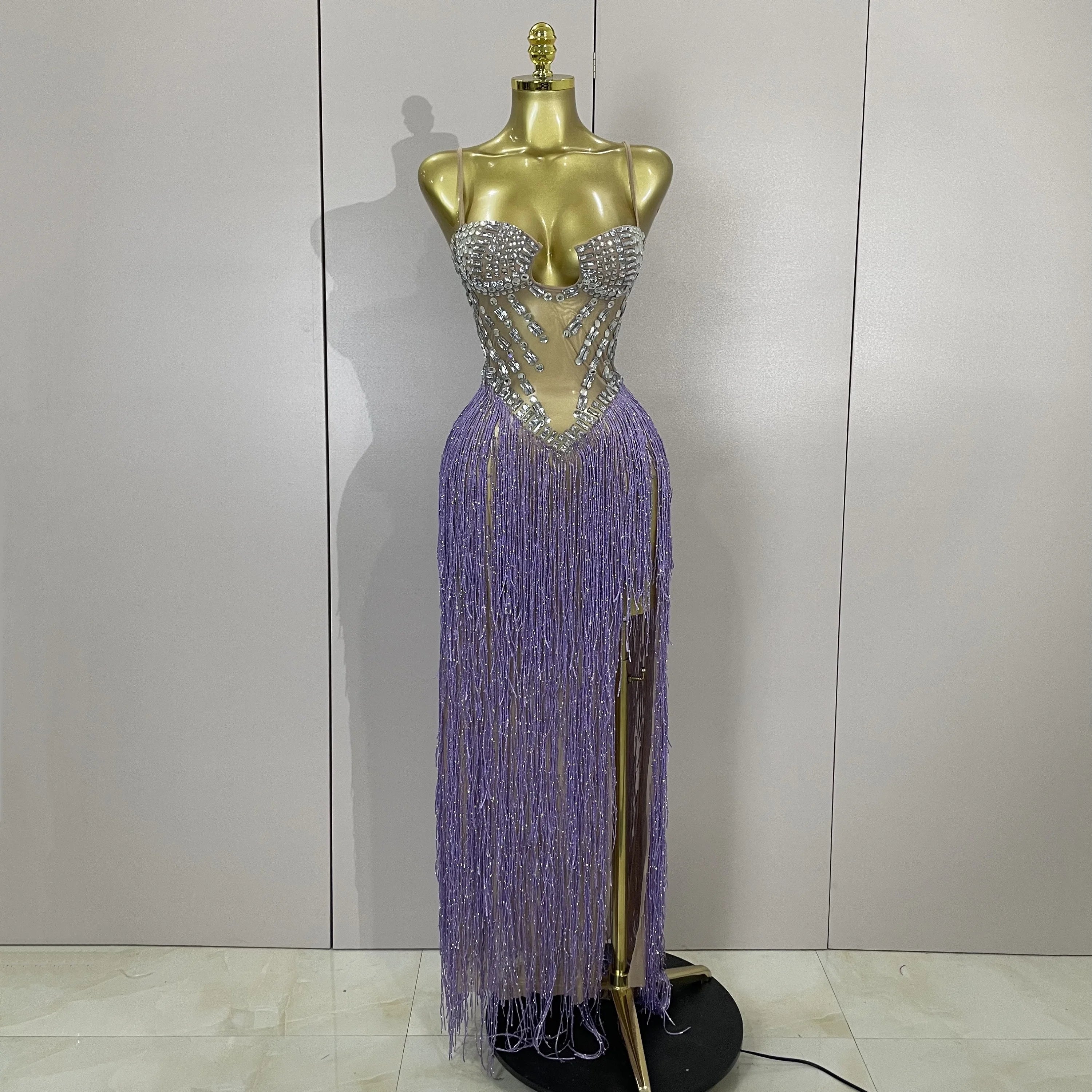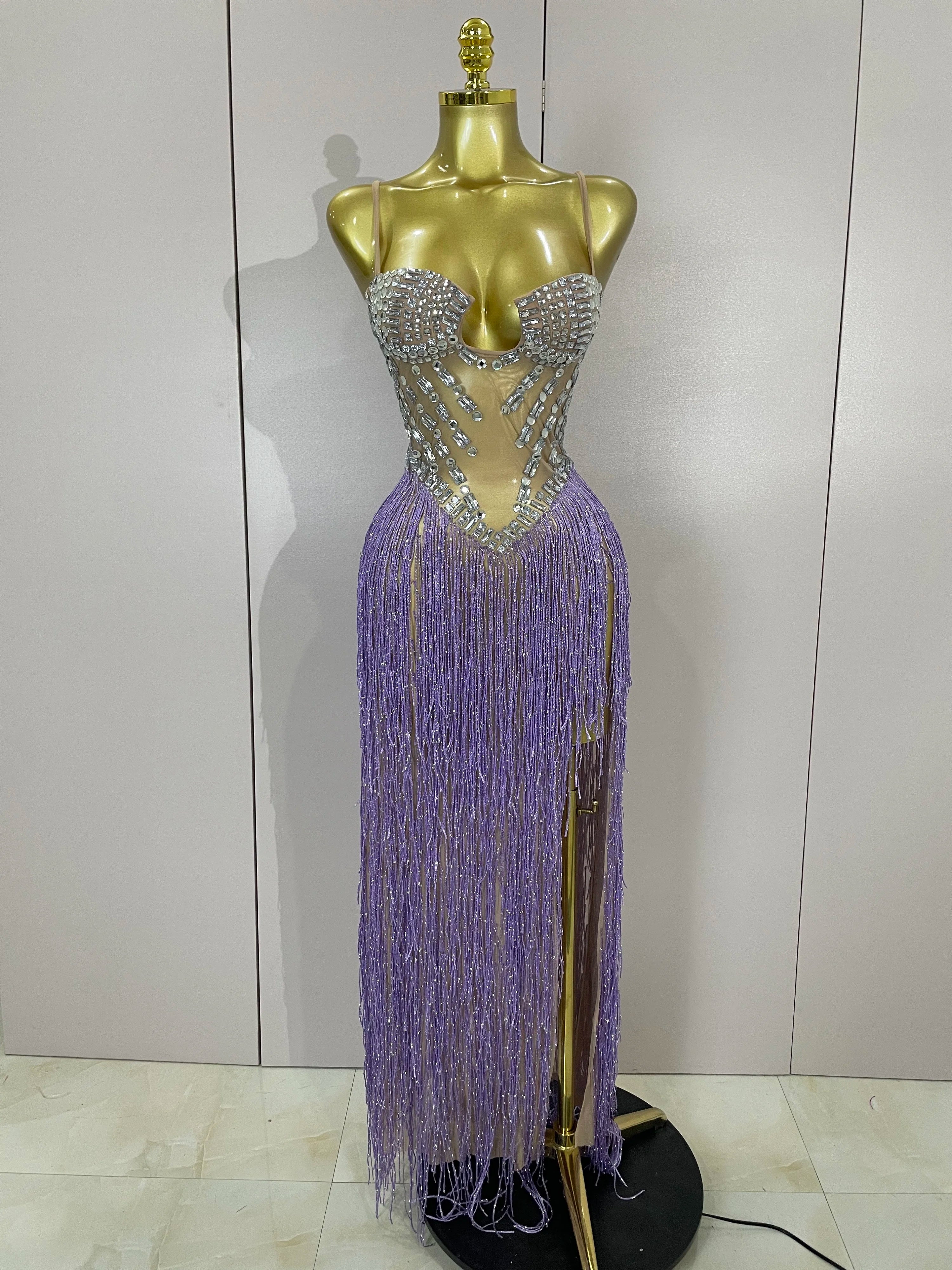 Cleo sheer mesh long dress with rhinestones, glitter, and tassel details for women’s evening, club, or stage wear.