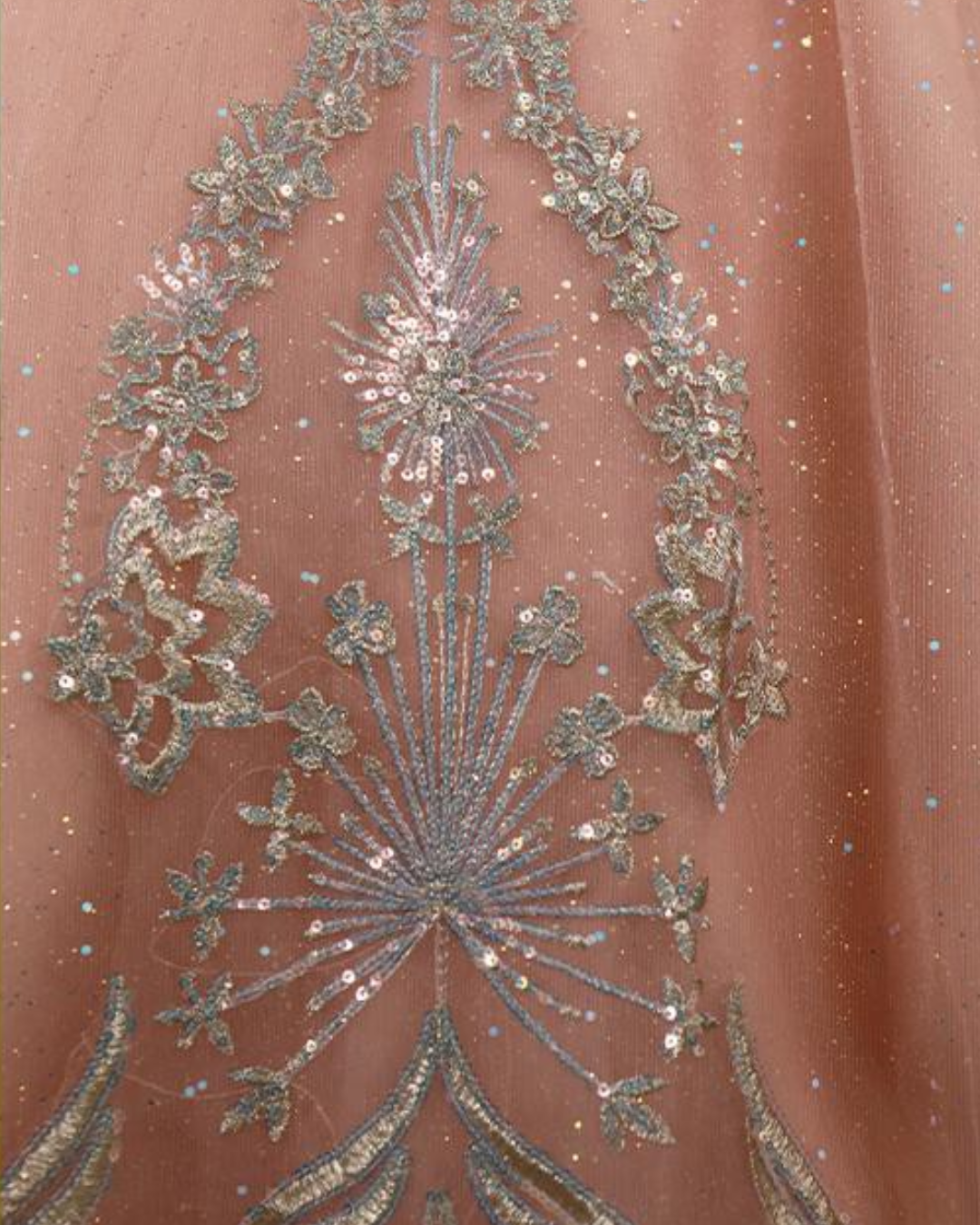 Step into your fairytale moment with this Blush Pink Glitter Quinceañera Ball Gown adorned with stunning silver appliqués. The shimmering glitter tulle and detailed embroidery create a soft, dreamy glow under every light. With its fitted corset bodice and voluminous skirt, this gown is pure elegance — perfect for a princess who loves sparkle and sophistication.