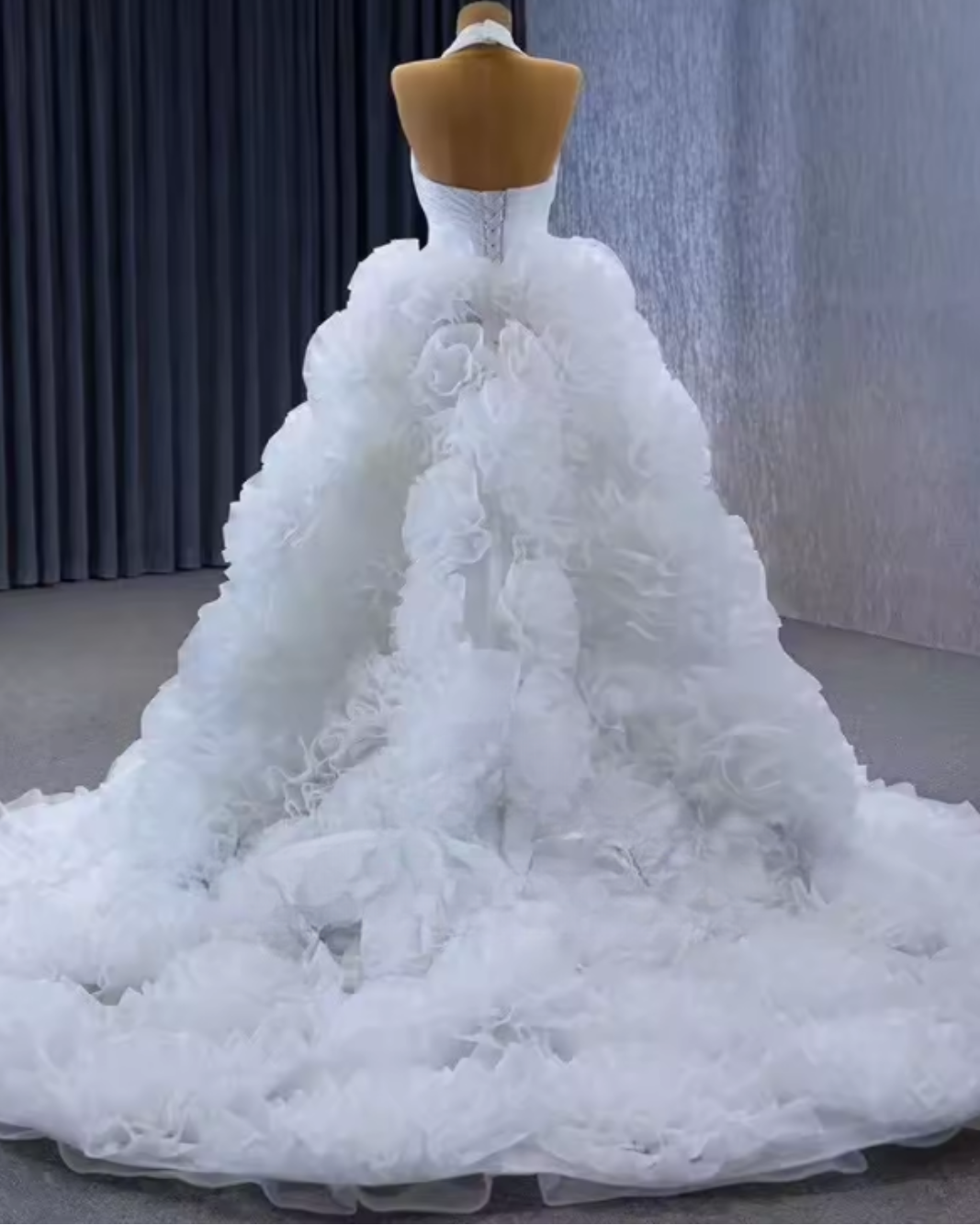 Halter Criss Cross Sleeveless Ruffles Lace Up Back Wedding Dress