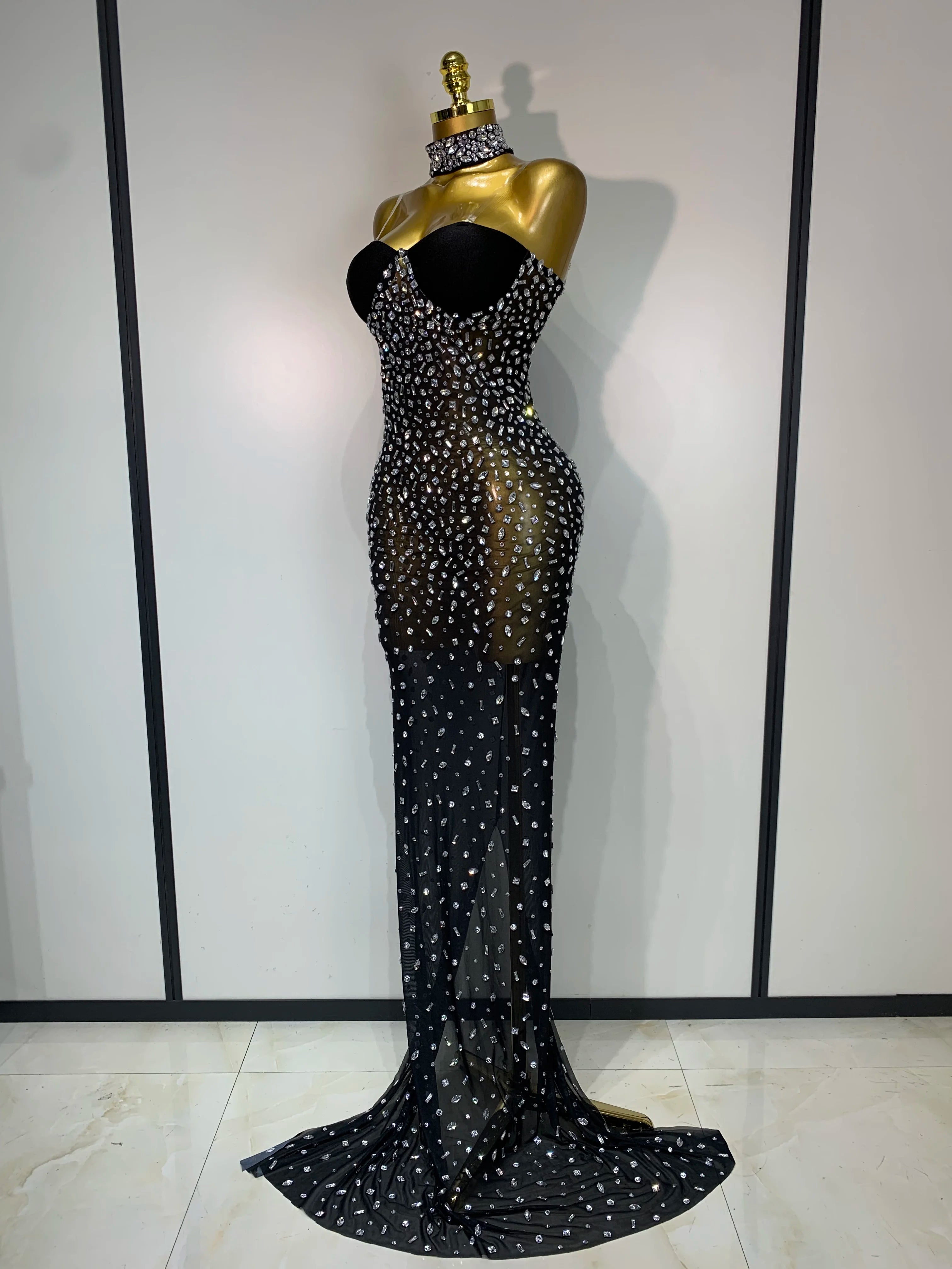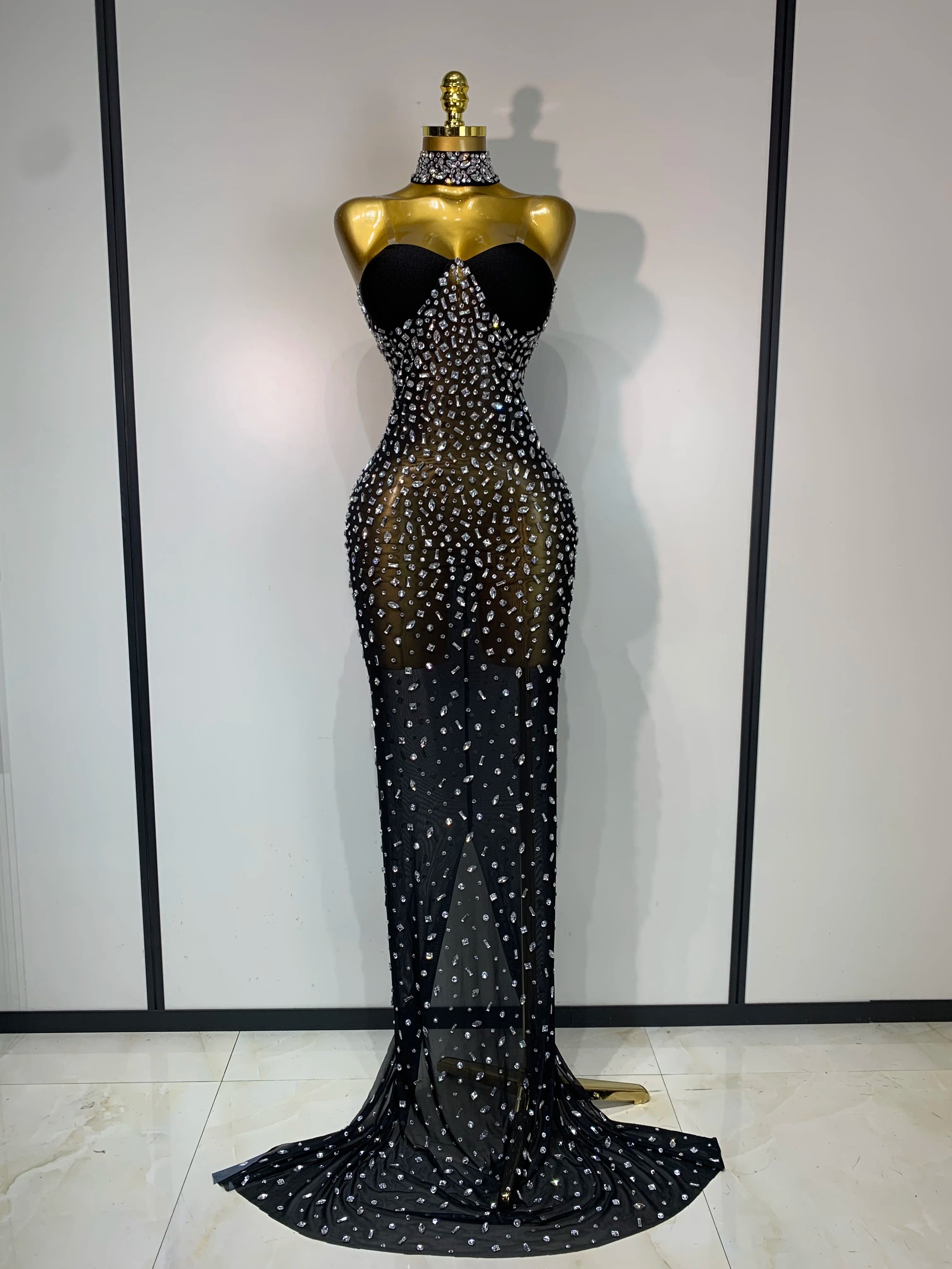 The Rhea maxi dress is built for moments that demand pure glamour. Crafted from transparent mesh and covered in sparkling rhinestones, this gown creates a dramatic silhouette that glows under lights and cameras. The long, flowing design shapes the body with a smooth, elegant line, making it ideal for evening parties, red carpet events, weddings, stage performances or high end celebrations. Its luxurious detailing and sleek finish offer a show stopping look that feels both modern and unforgettable.