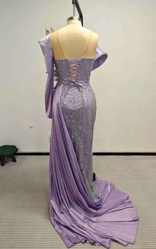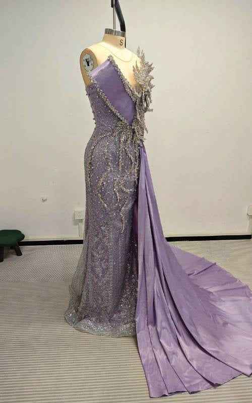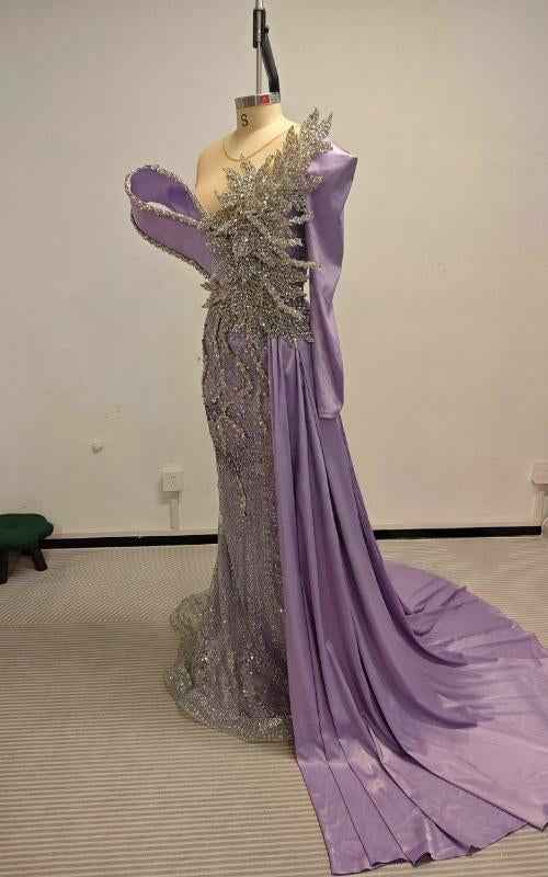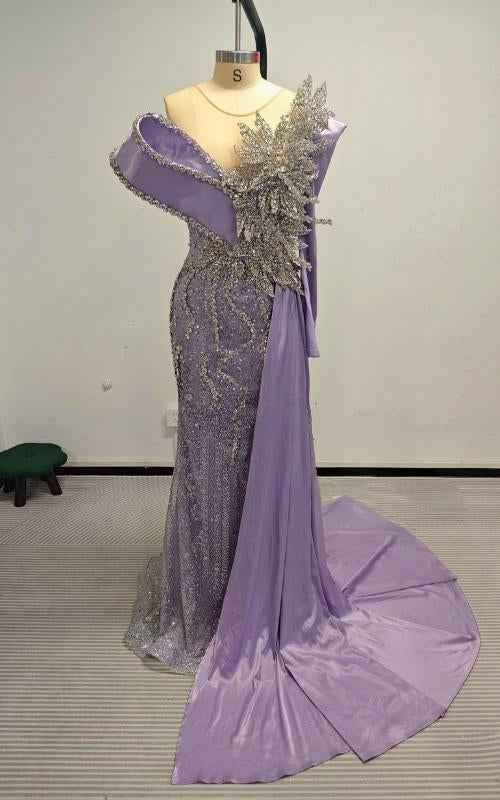 Lavender Crystal-Encrusted Mermaid Gown With Architectural Satin Drape And Silver Leaf Embroidery