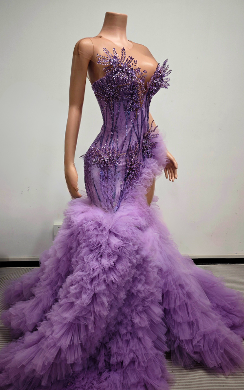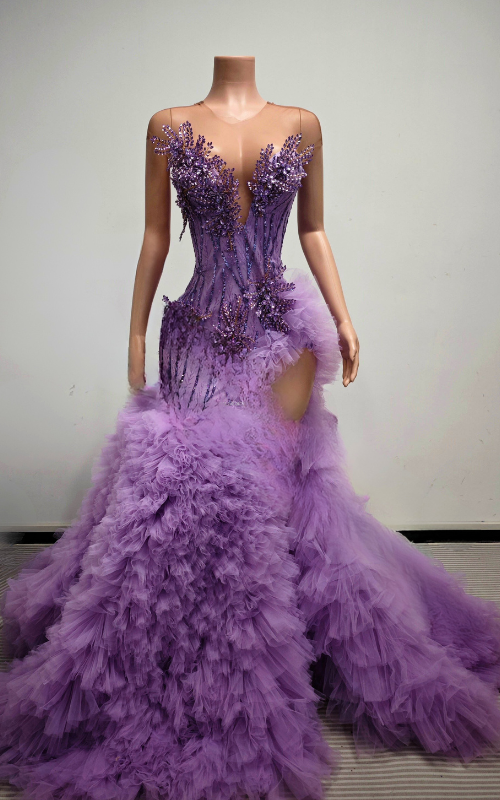 Purple Beaded Crystal Ruffled High Slit Long Prom Dress