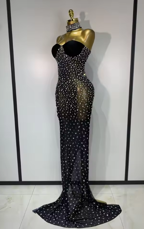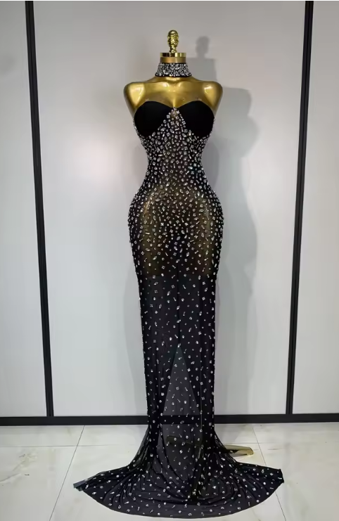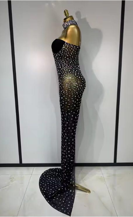 Rhian is pure after-dark energy. This luxury maxi dress features a sheer mesh base layered with sparkling rhinestones that catch every light in the room. Designed to sculpt the body while keeping things daring and dramatic, it’s made for nights that don’t end early. Perfect for upscale parties, birthdays, stage looks, and bold evening moments where subtle is not the goal.