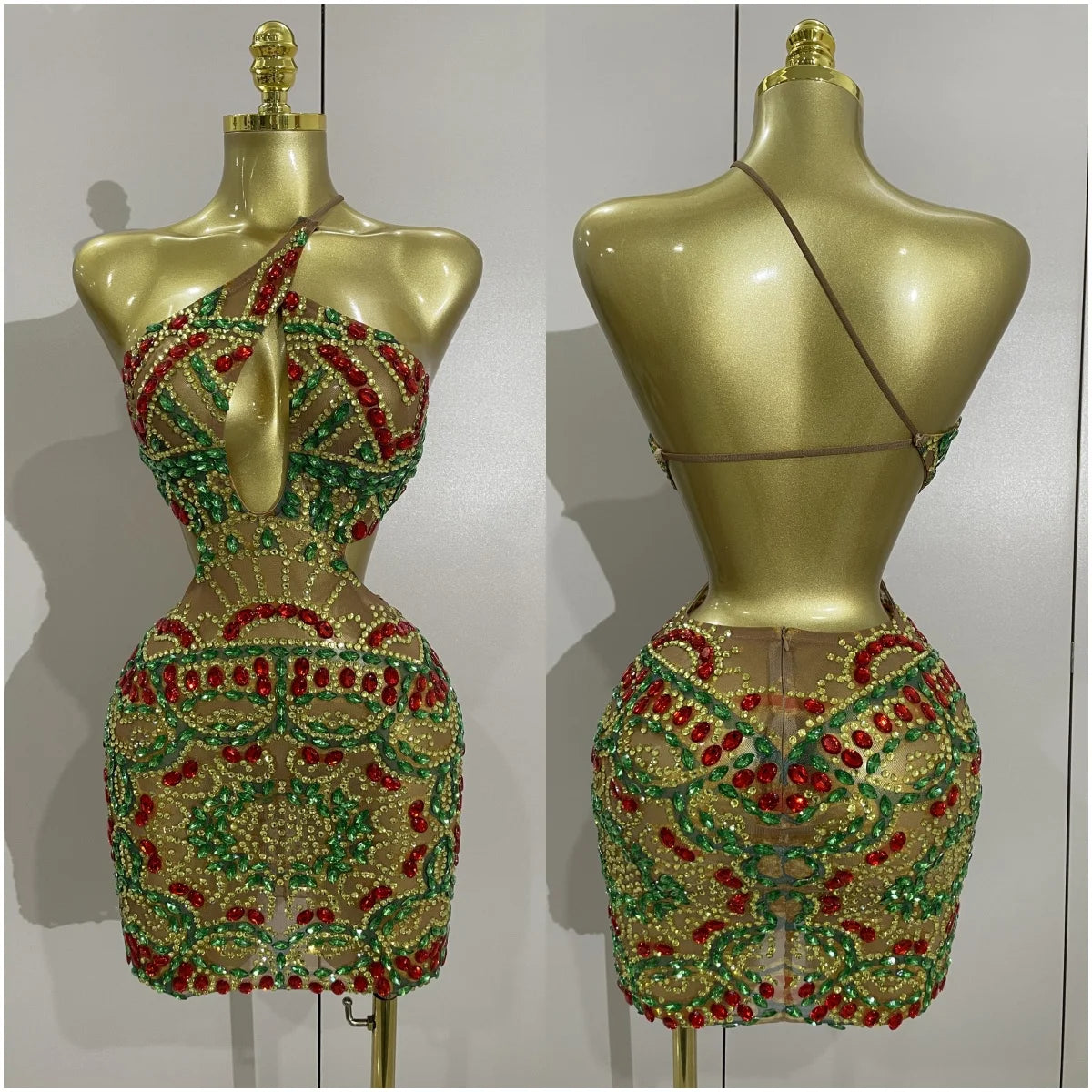 Luxury color rhinestone mesh mini dress with sparkling crystals for birthday, DJ, or club wear.