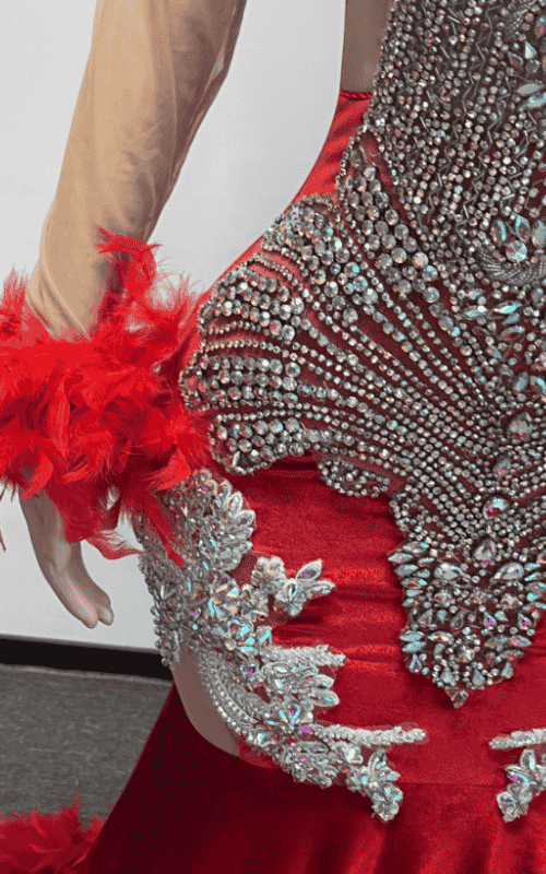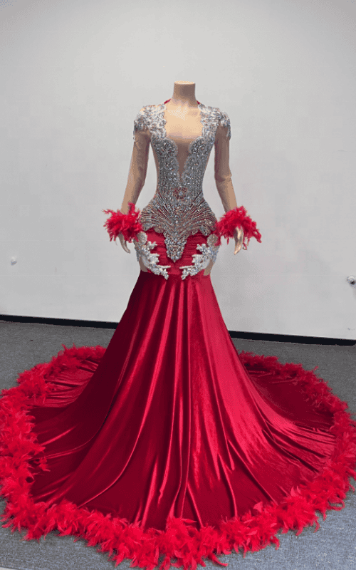 The lace appliqué bodice adds depth and handcrafted elegance, sculpting the silhouette while highlighting fine detailing. Feather cuffs bring soft couture energy, creating movement with every gesture. The feather-trimmed sweep train extends the drama, gliding behind you for a red-carpet finish that photographs beautifully.